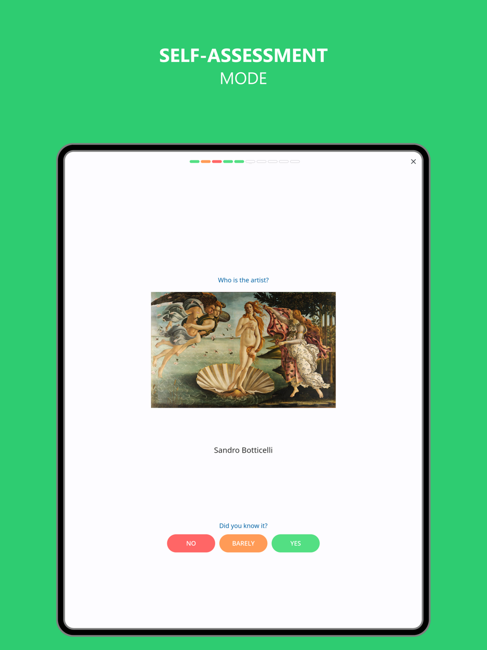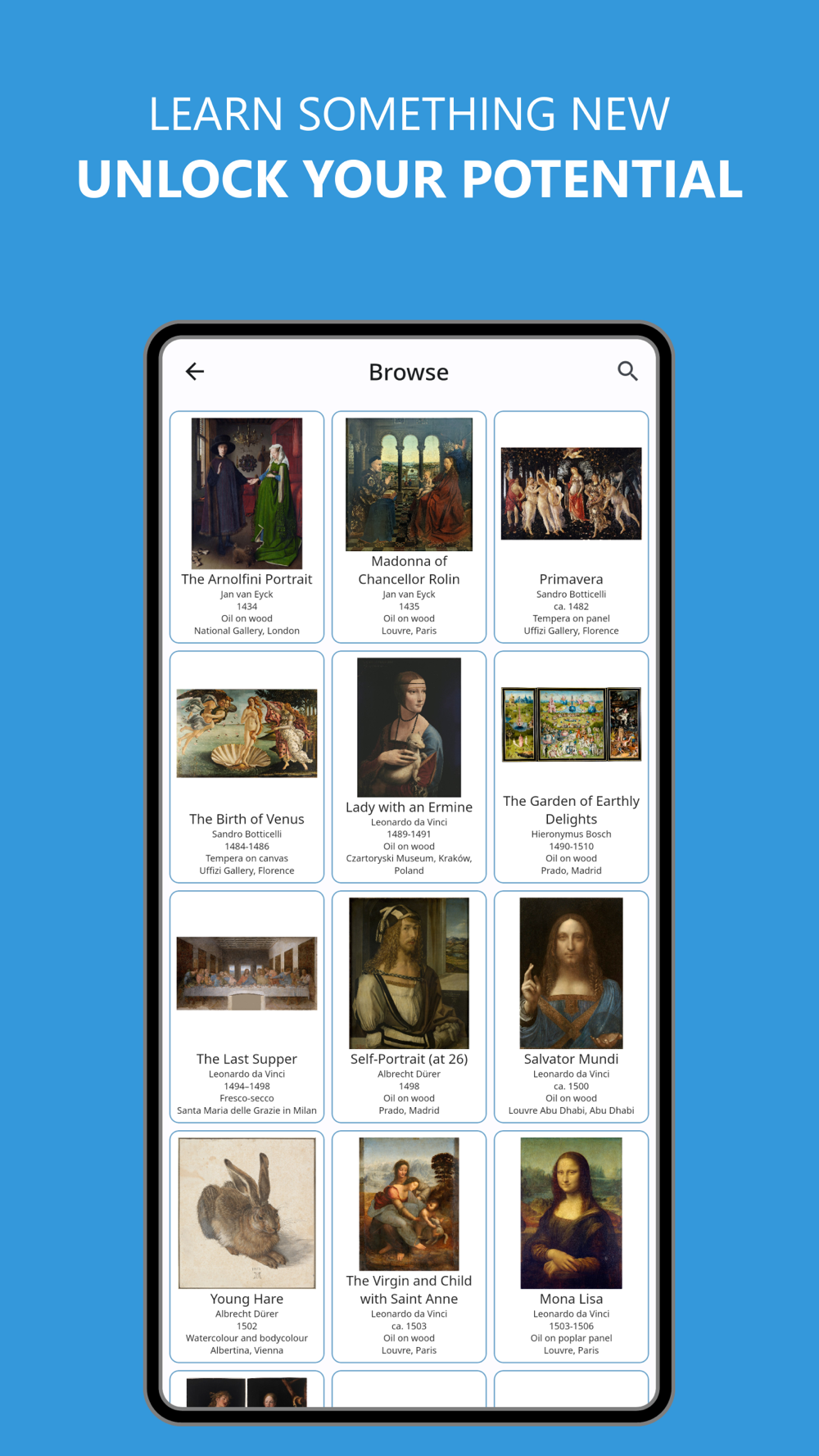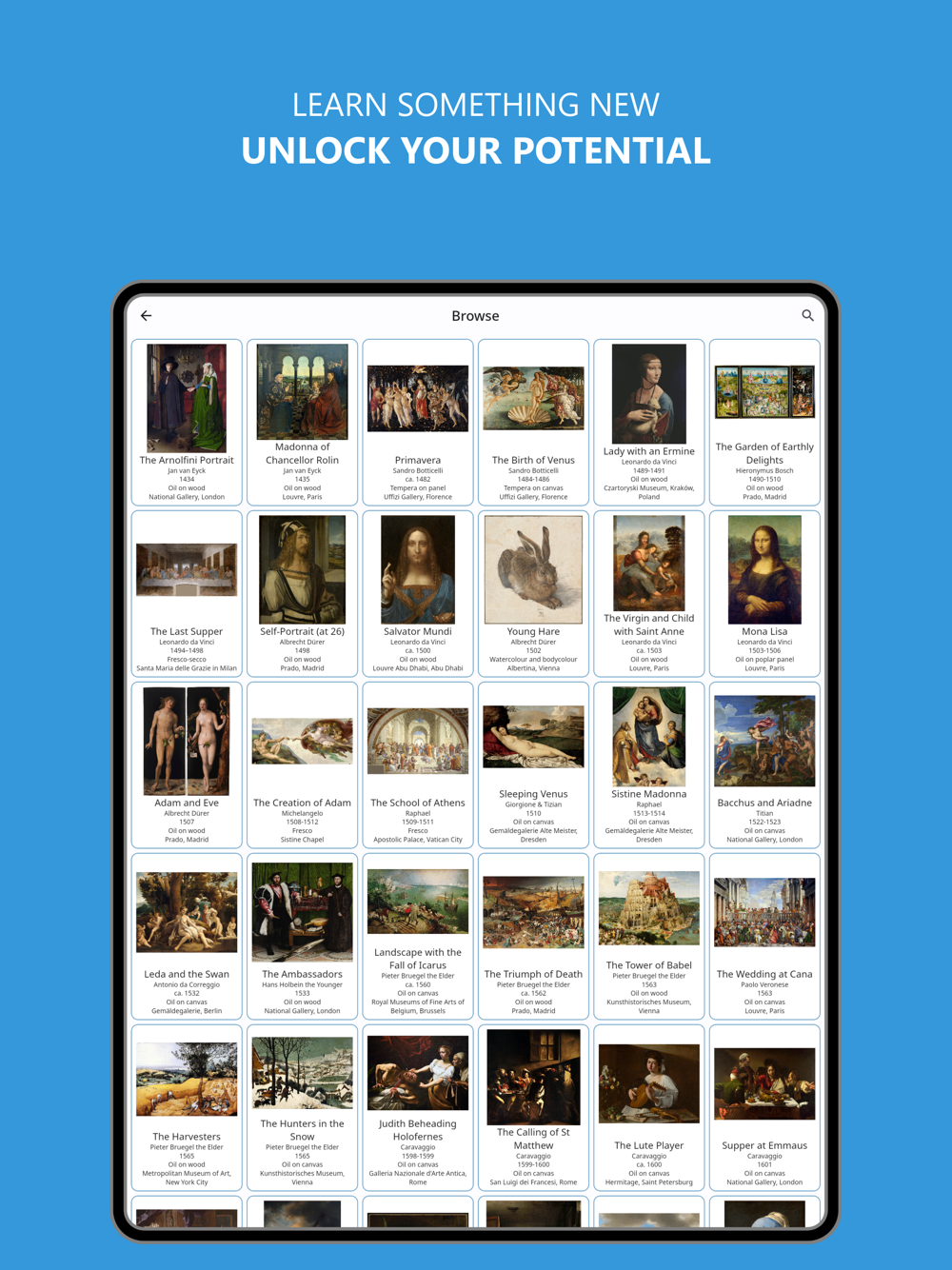 Embark on a captivating journey of discovery through art history. Easily learn to recognize famous paintings. Whether title, artist, time of origin or applied techniques - you will master it all!