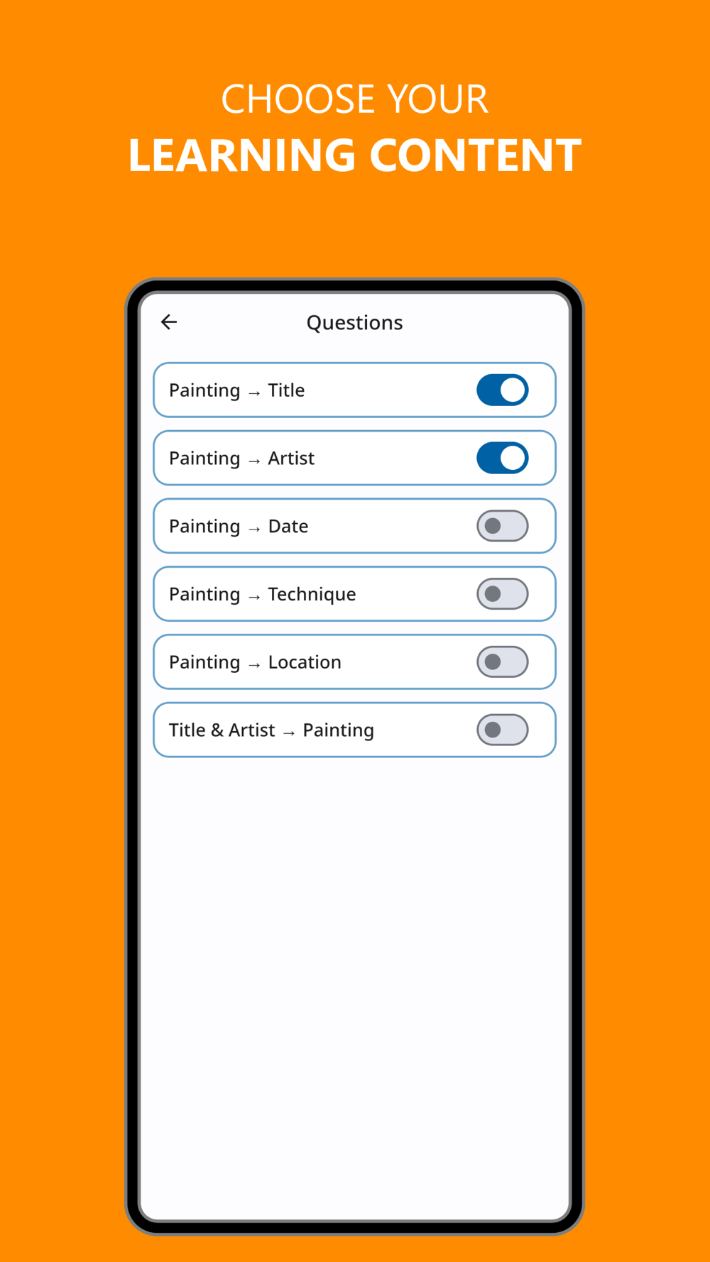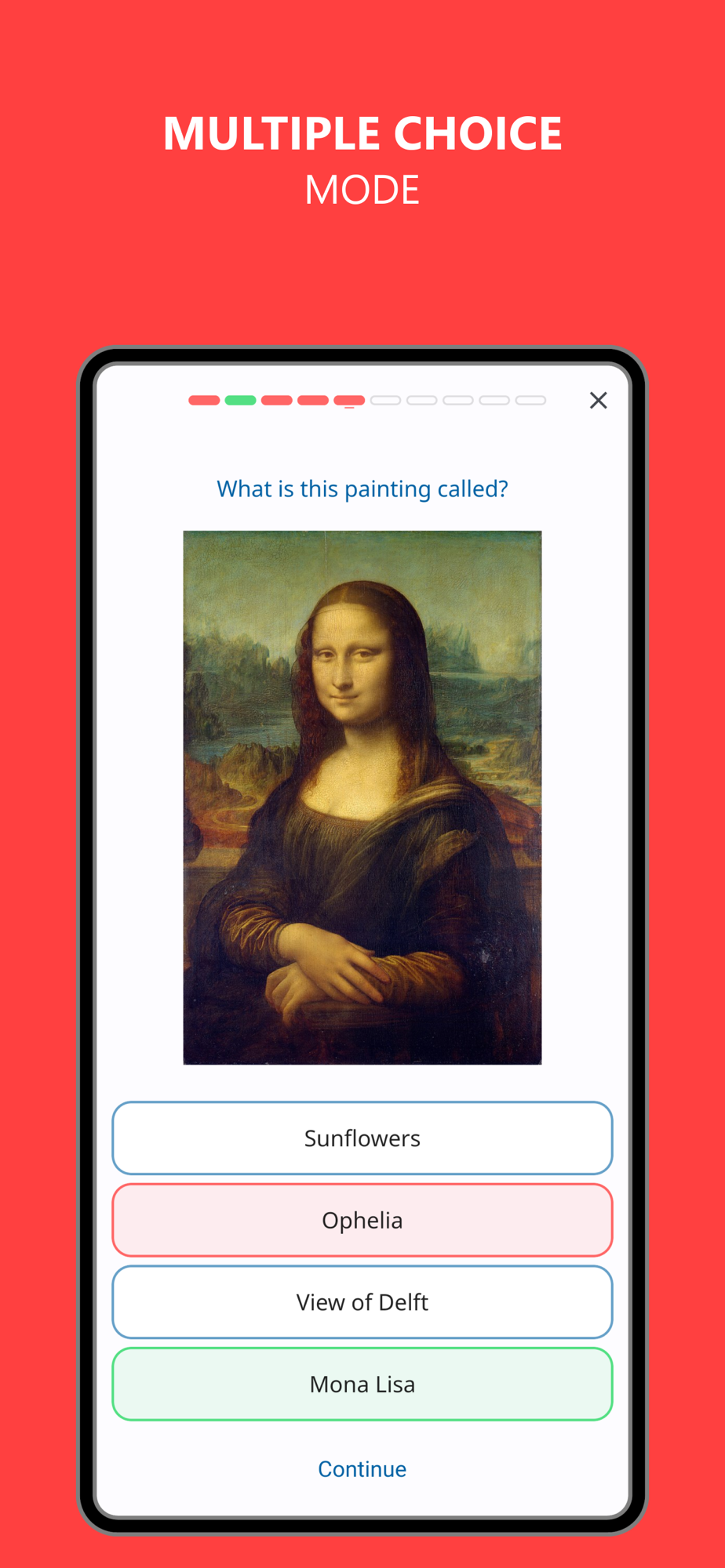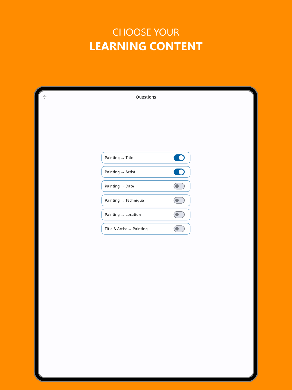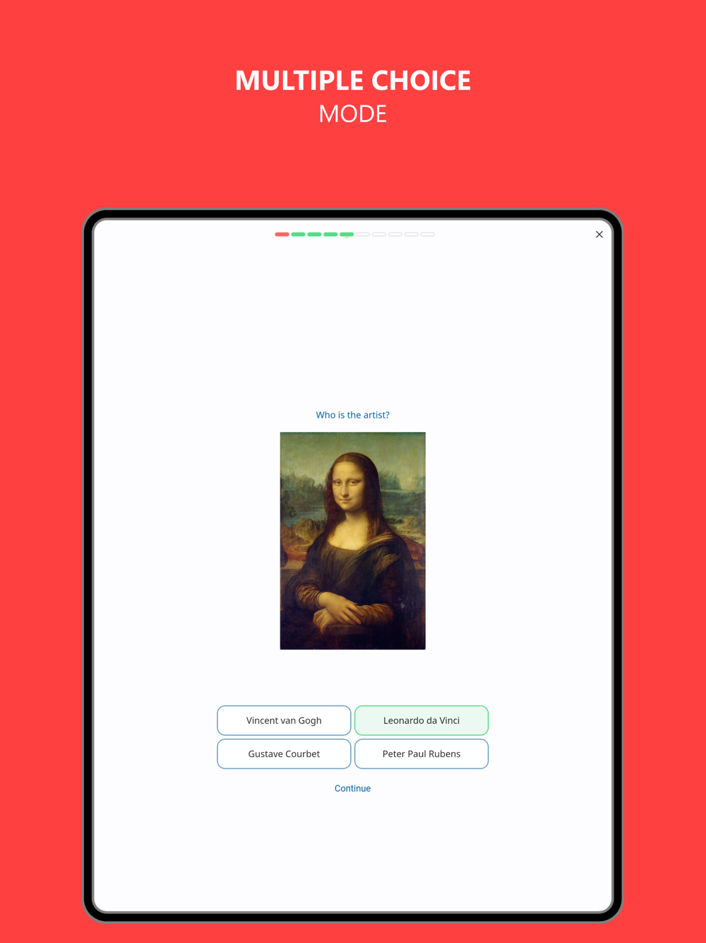Embark on a captivating journey of discovery through art history. Easily learn to recognize famous paintings. Whether title, artist, time of origin or applied techniques - you will master it all!