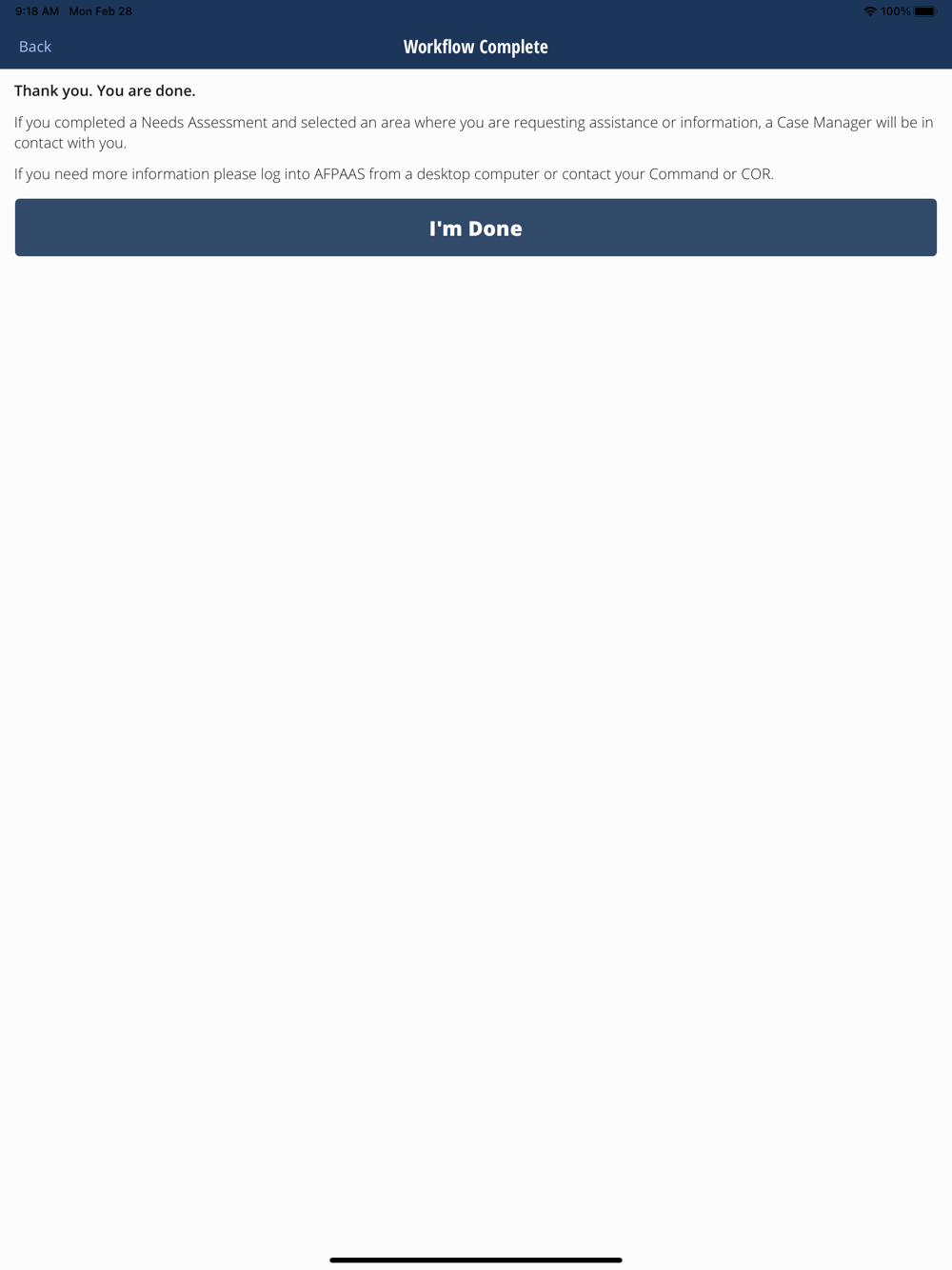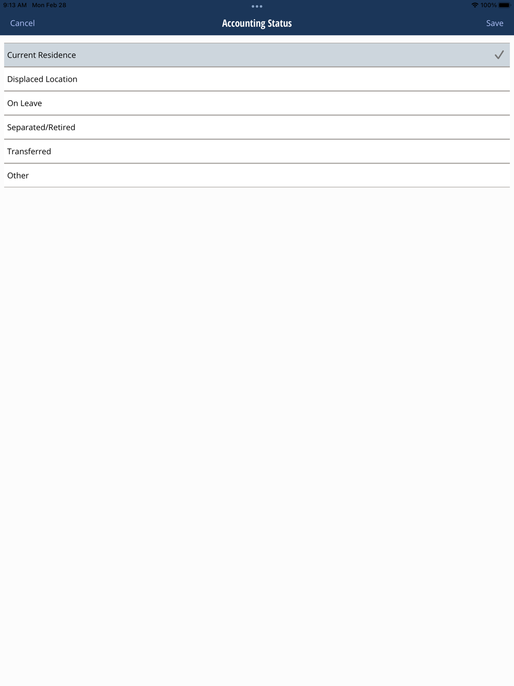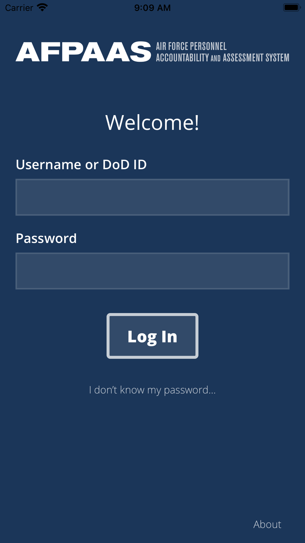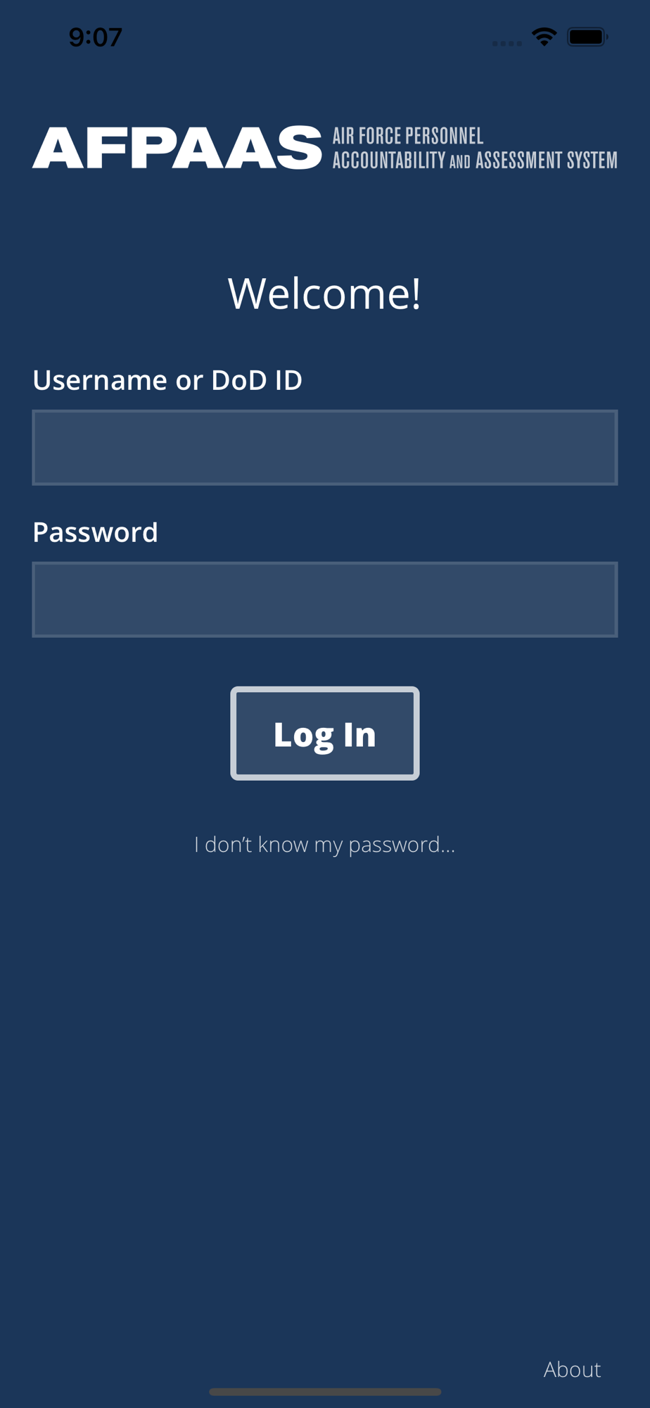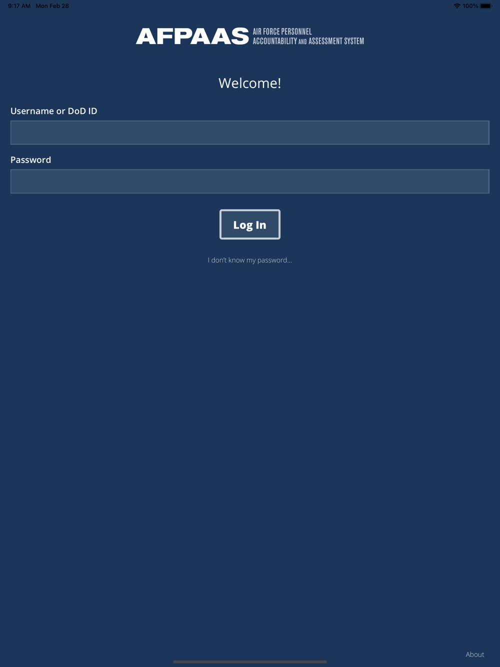 The AFPAAS mobile app allows account holders access to verify and/or update information as stored on the Enterprise DoD web application, referenced here as AFPAAS - Air Force Disaster Personnel Accountability and Assessment System. AFPAAS provides users the opportunity to Report Accounting Status, Update and Verify Contact Information, Update and Verify Location Information, Complete Needs Assessments, and View Reference Information.