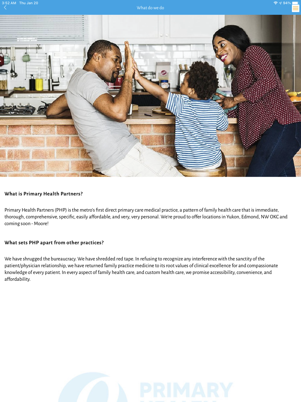 Primary Health Partners (PHP) is Oklahoma’s largest direct primary care (DPC) medical practice, a subscription based healthcare model that is immediate, thorough, comprehensive, specific, easily affordable, and very, very personal. We're proud to offer locations in Yukon, Edmond, NW OKC and Moore!