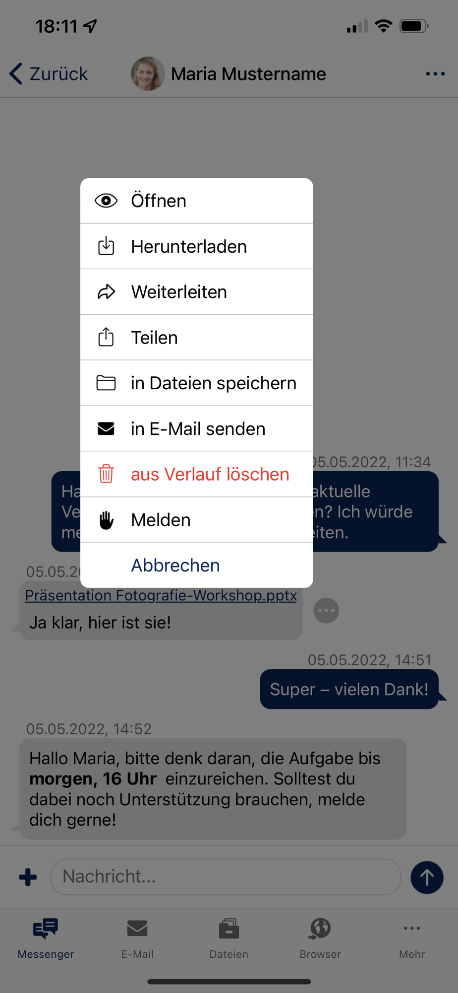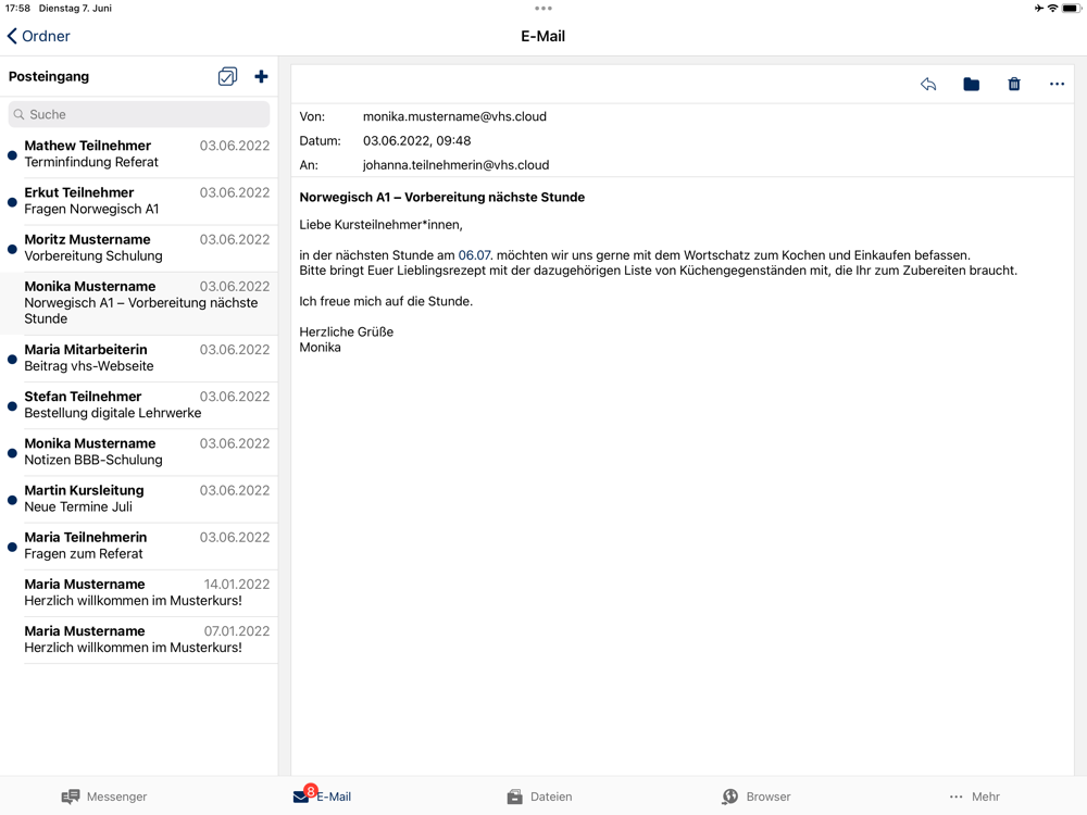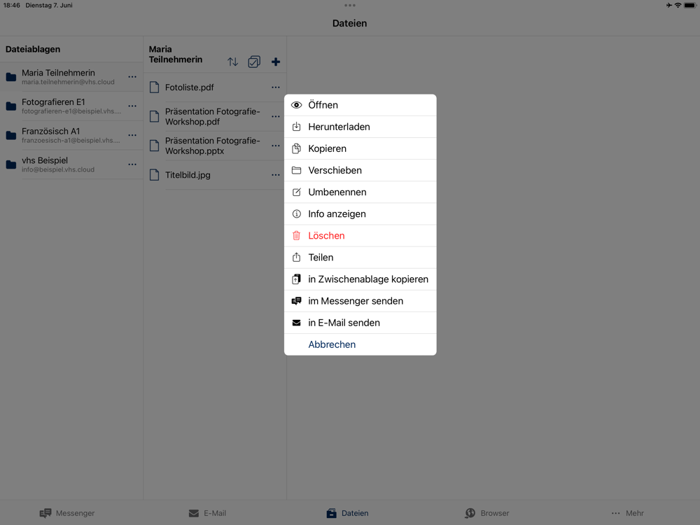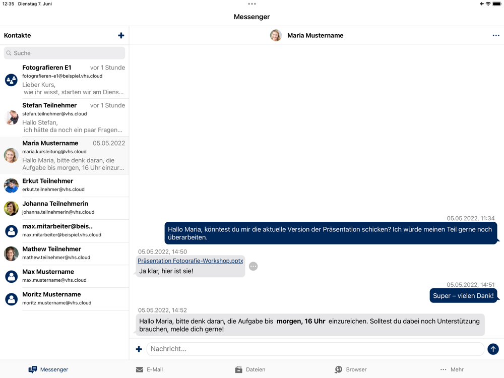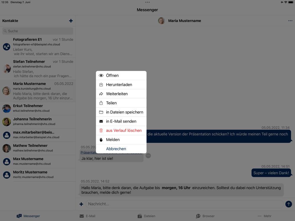 - Text-Nachrichten, Fotos, Videos, beliebige Dateien und Sprachnachrichten an Kontakte, Kurse oder Gruppen senden, empfangen und weiterleiten. Empfangene Dateien in den Dateiablagen auf der vhs.cloud sichern. Dateien aus anderen Apps über den Messenger mit anderen teilen (iPad: Drag & Drop in Slide Over oder Split View).