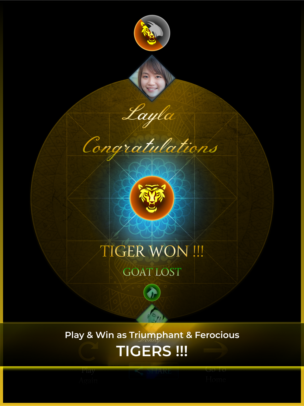 Participate in an ancient battle of BAGH CHAL, where the Cunning Docility and the Unity within a Herd of GOATS try to overcome and survive against the very symbol of Primal Ruthlessness and the Individual Ferocity, the TIGERS.