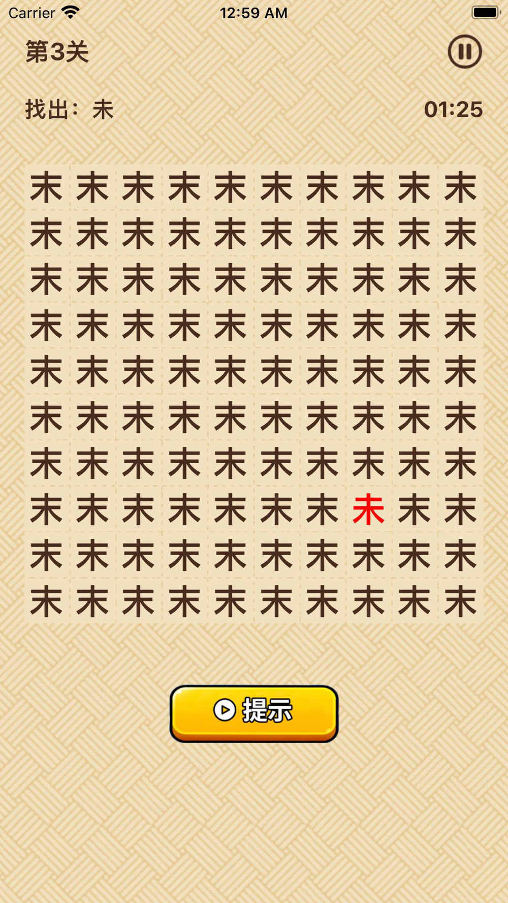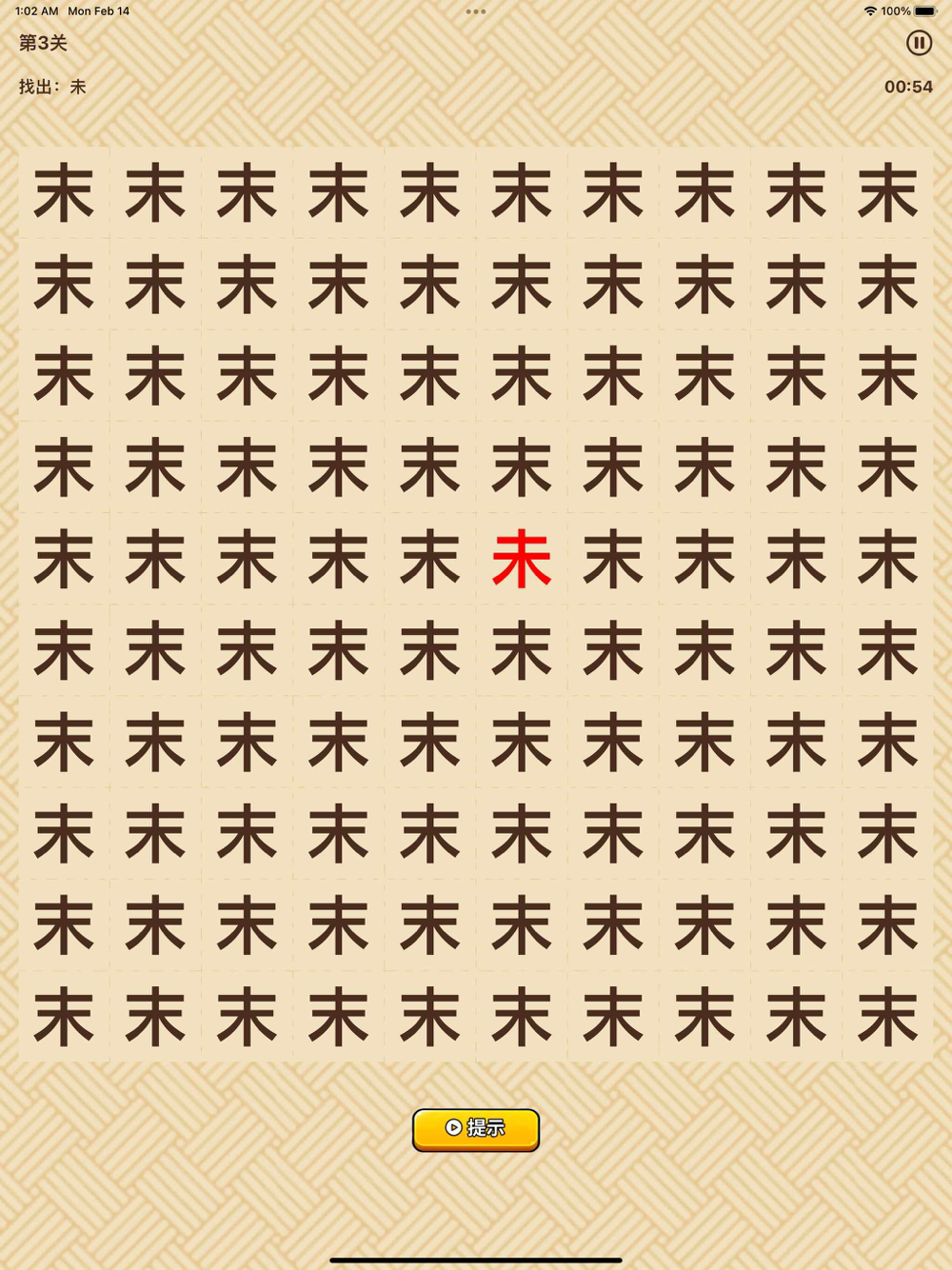 这是一款汉字找不同的小游戏,从99个外形相似的文字中找出1个不同的字即可过关,超过时间未找出或者找错了则过关失败,考验你的眼力~