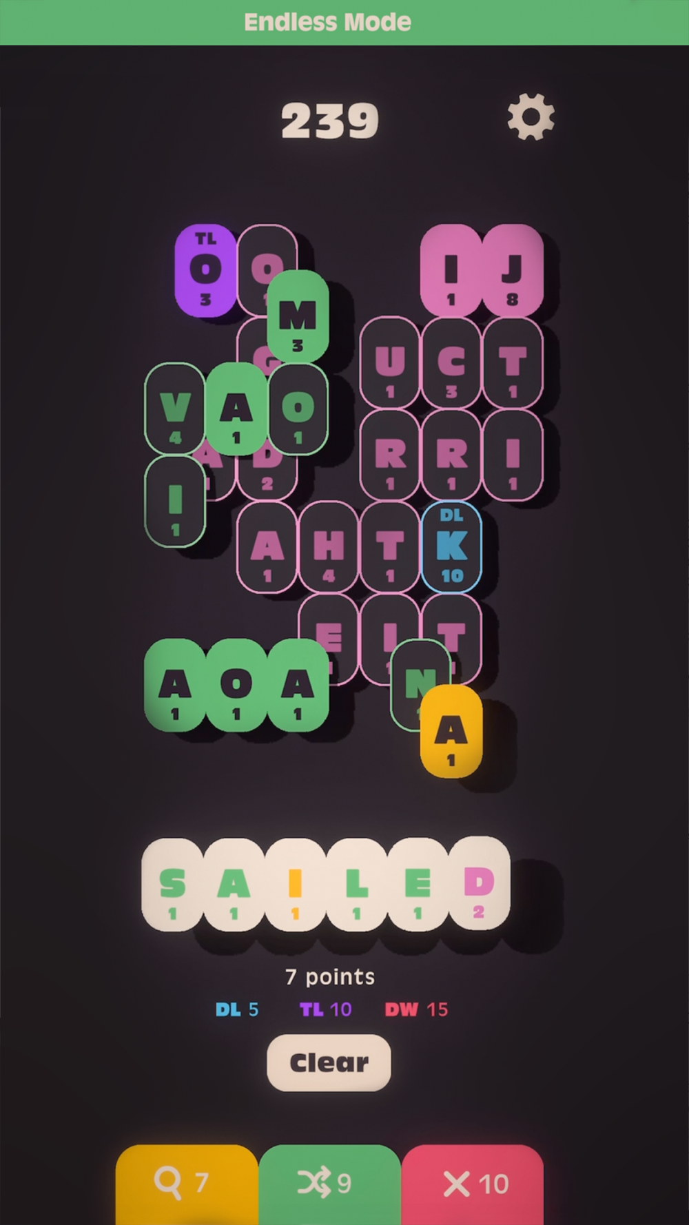 Use the available tiles to spell words and uncover more letters. Combine special tiles for Double Letter, Triple Letter, and Double Word bonuses to rack up the points.