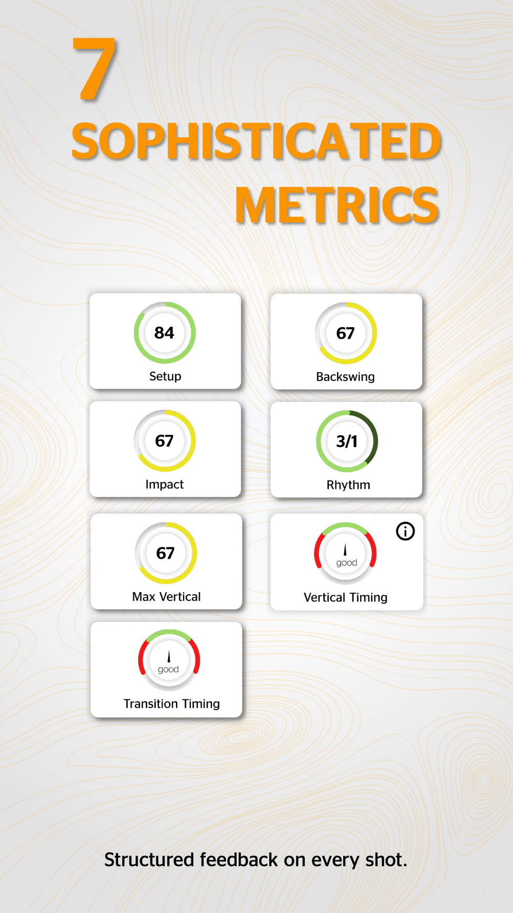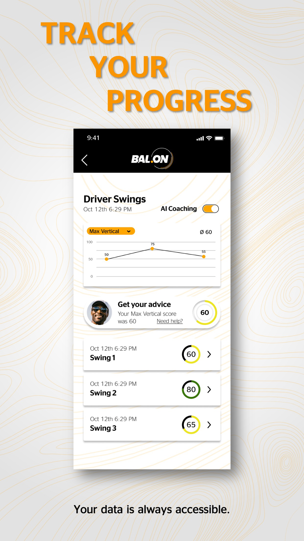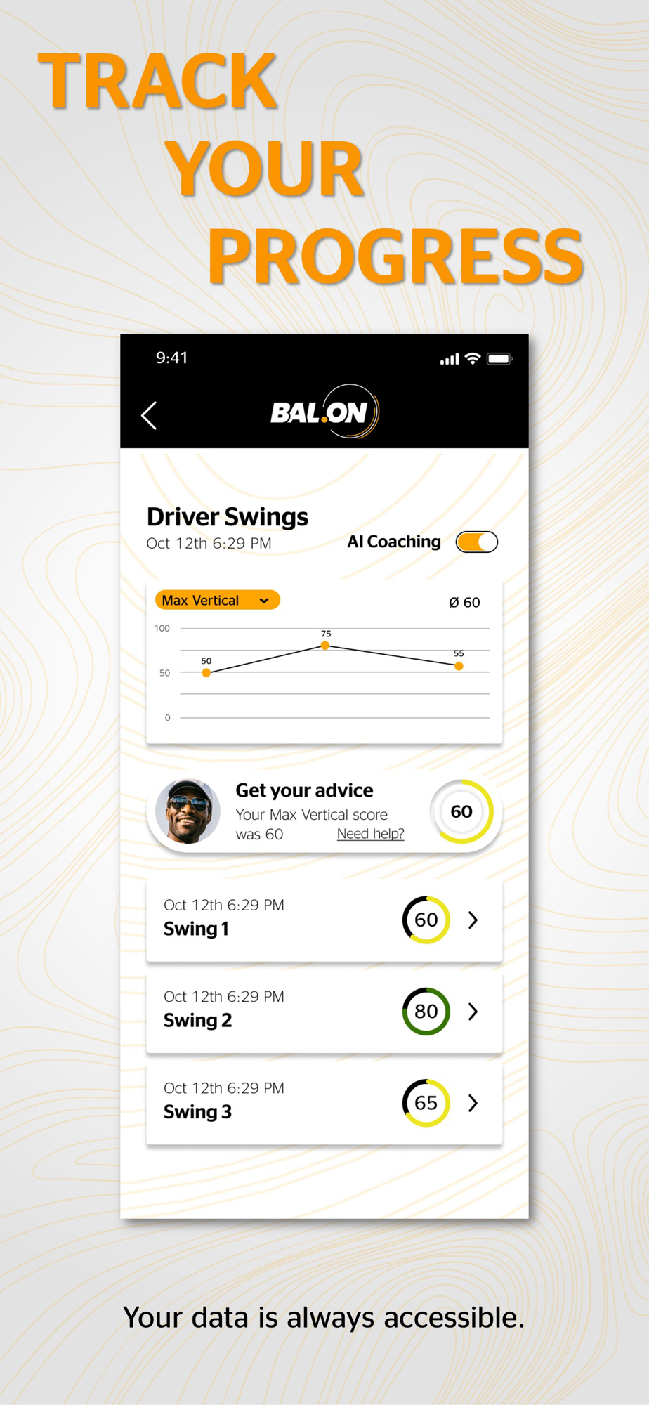 Specifically, BAL.ON analyzes your swing based on seven metrics. Optimize your Setup, Backswing, Transition, Impact, Max Vertical, Vertical Timing, and Rhythm. With BAL.ON, you'll master your technique and learn to put maximum power on the ball. Achieve your perfect swing and tap into your full golf potential!