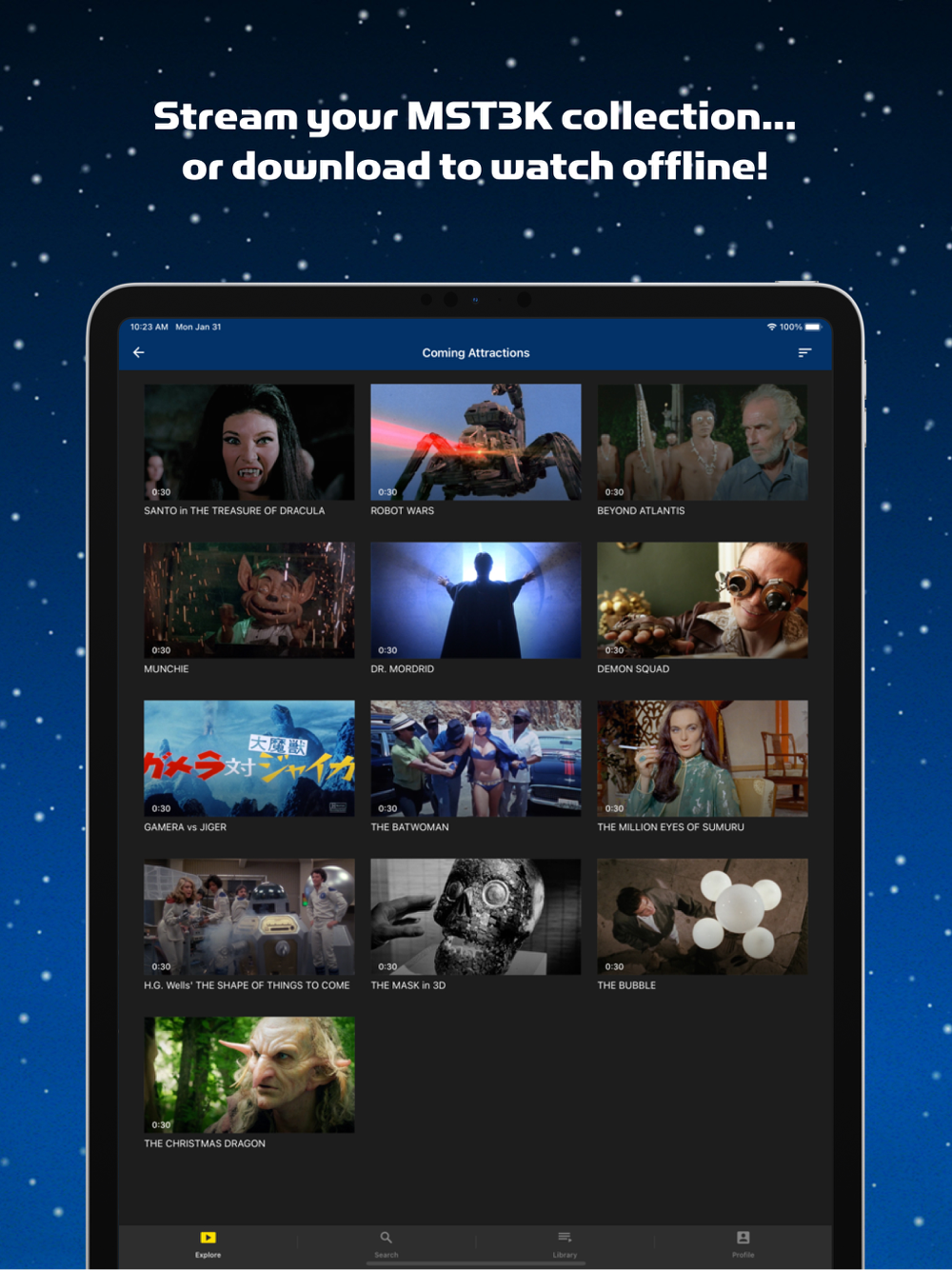 Plus, we've got more exclusive content and surprises planned all year long... so grab some snacks and drinks from your in-home concession counter, and join our human hosts and their robot pals as they endure the cheesiest movies the world has ever seen.