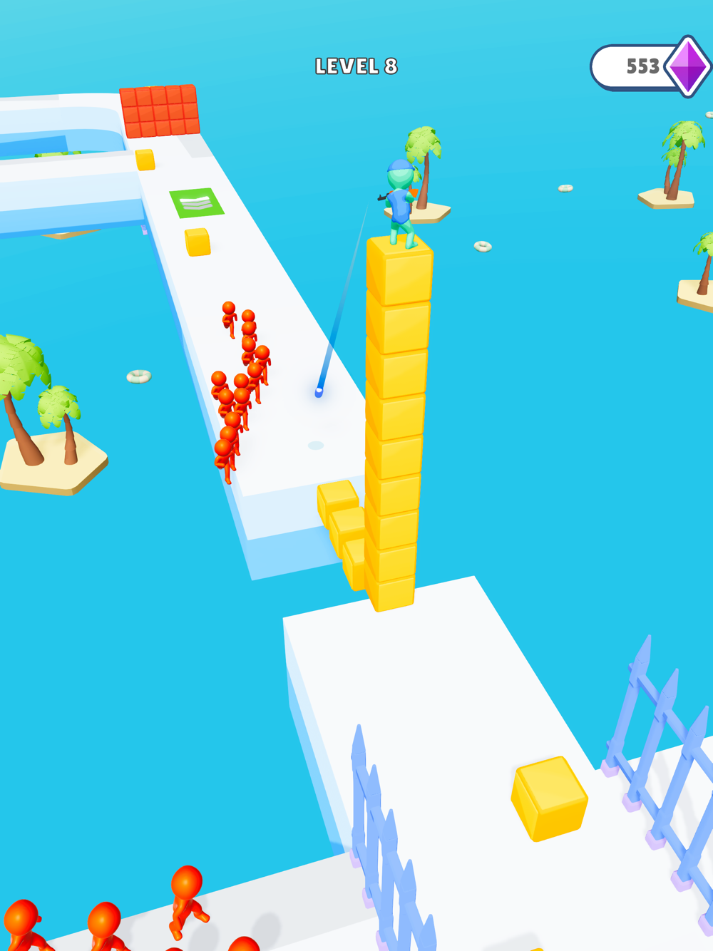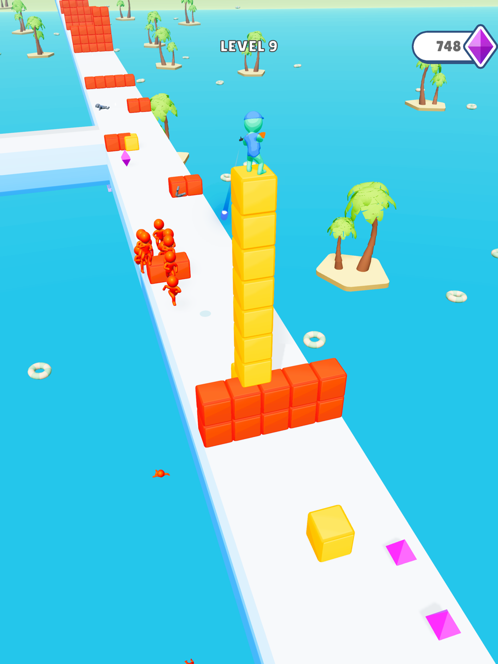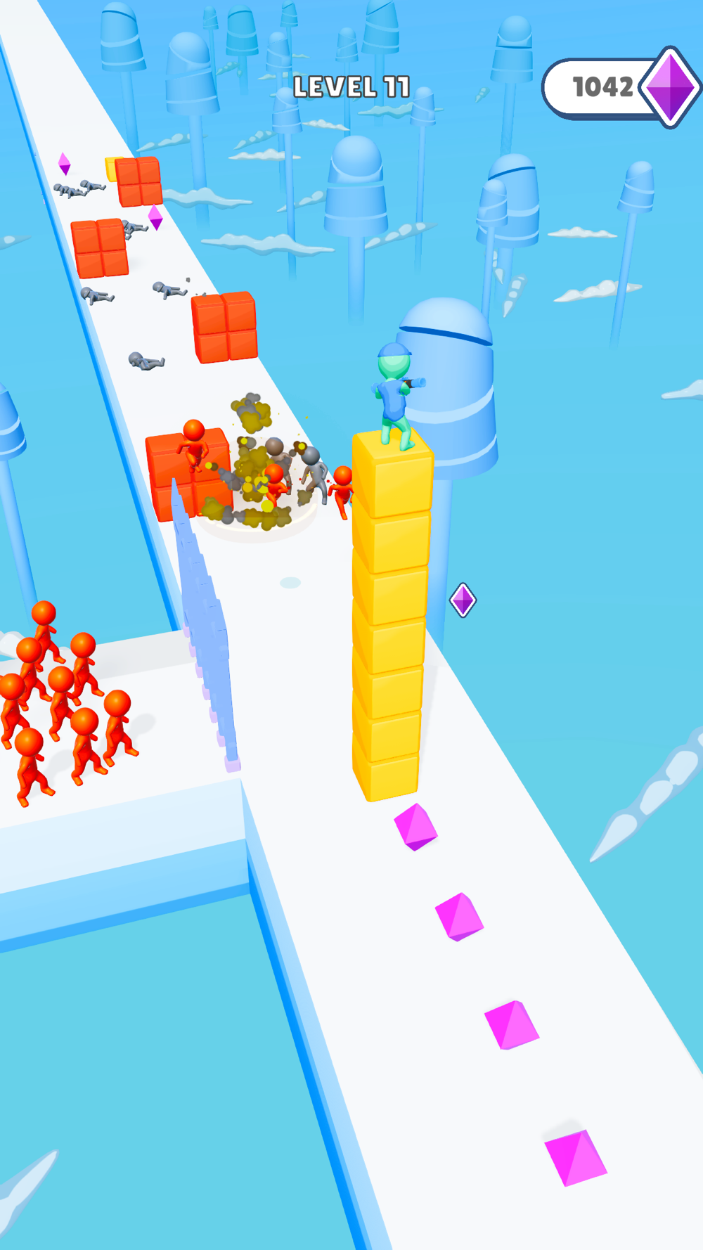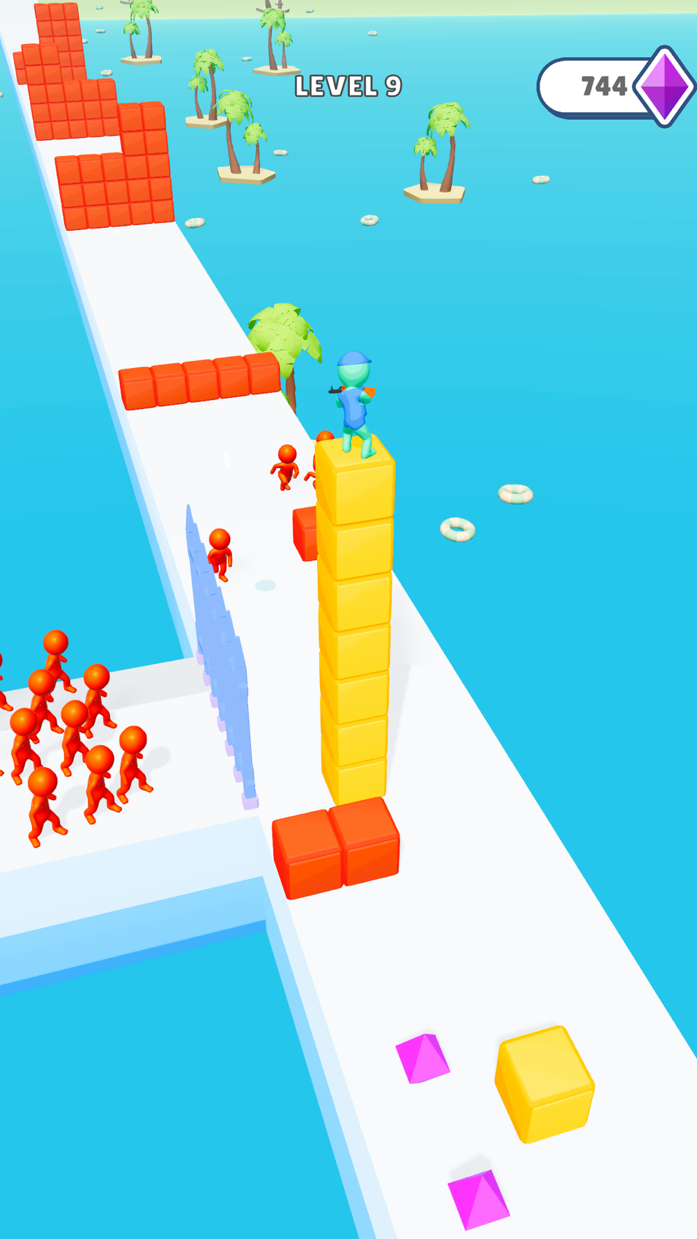 Stack and ride the cubes, shoot while surfing and escape from your enemies.