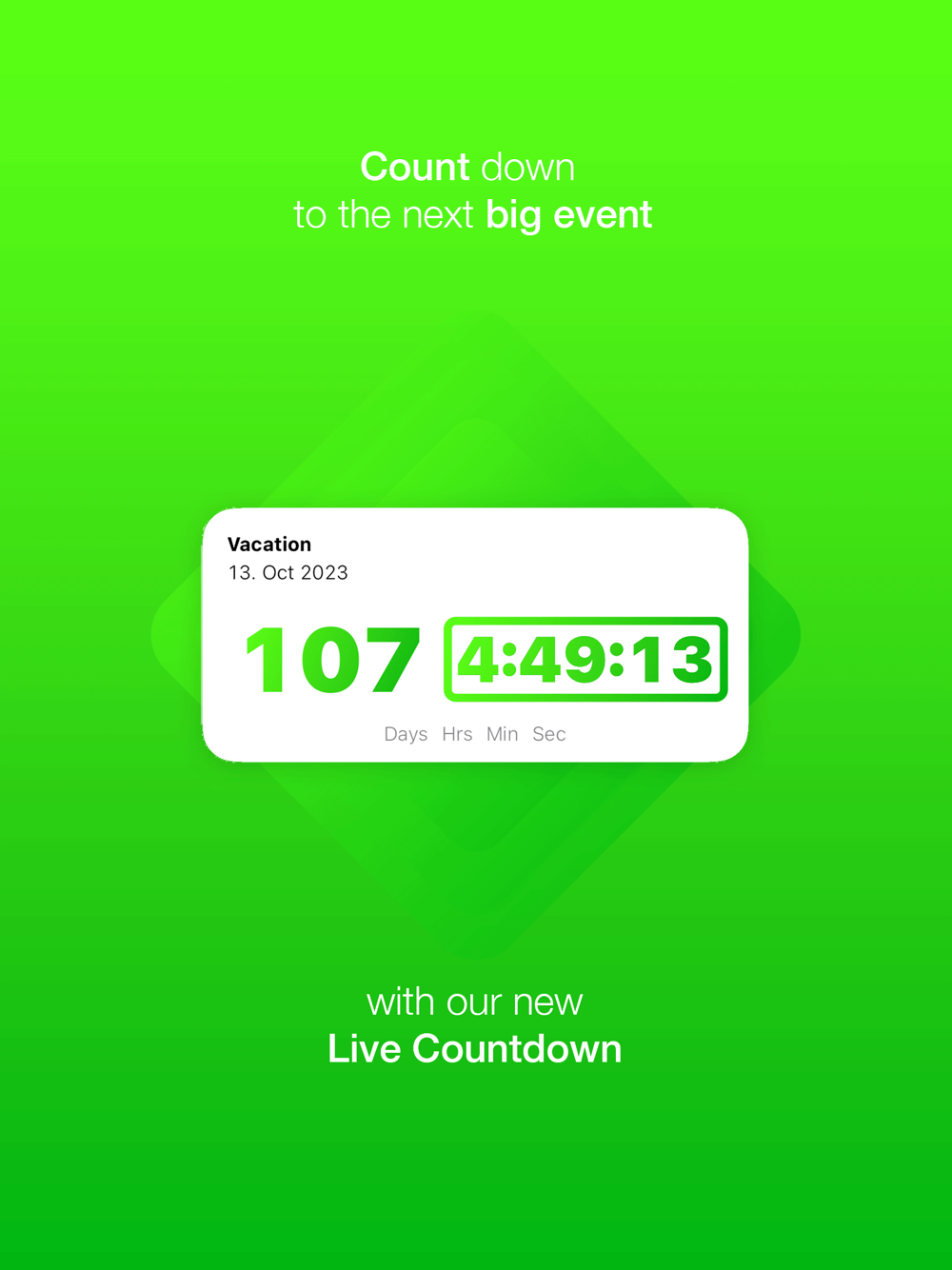 Countdown Widget & App also features real-time push notifications, which means you'll never miss an event or deadline. Plus, with our iCloud synchronization, you can easily keep your events in sync across all your devices.