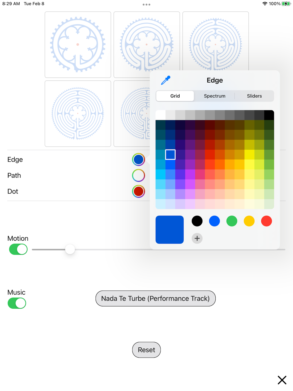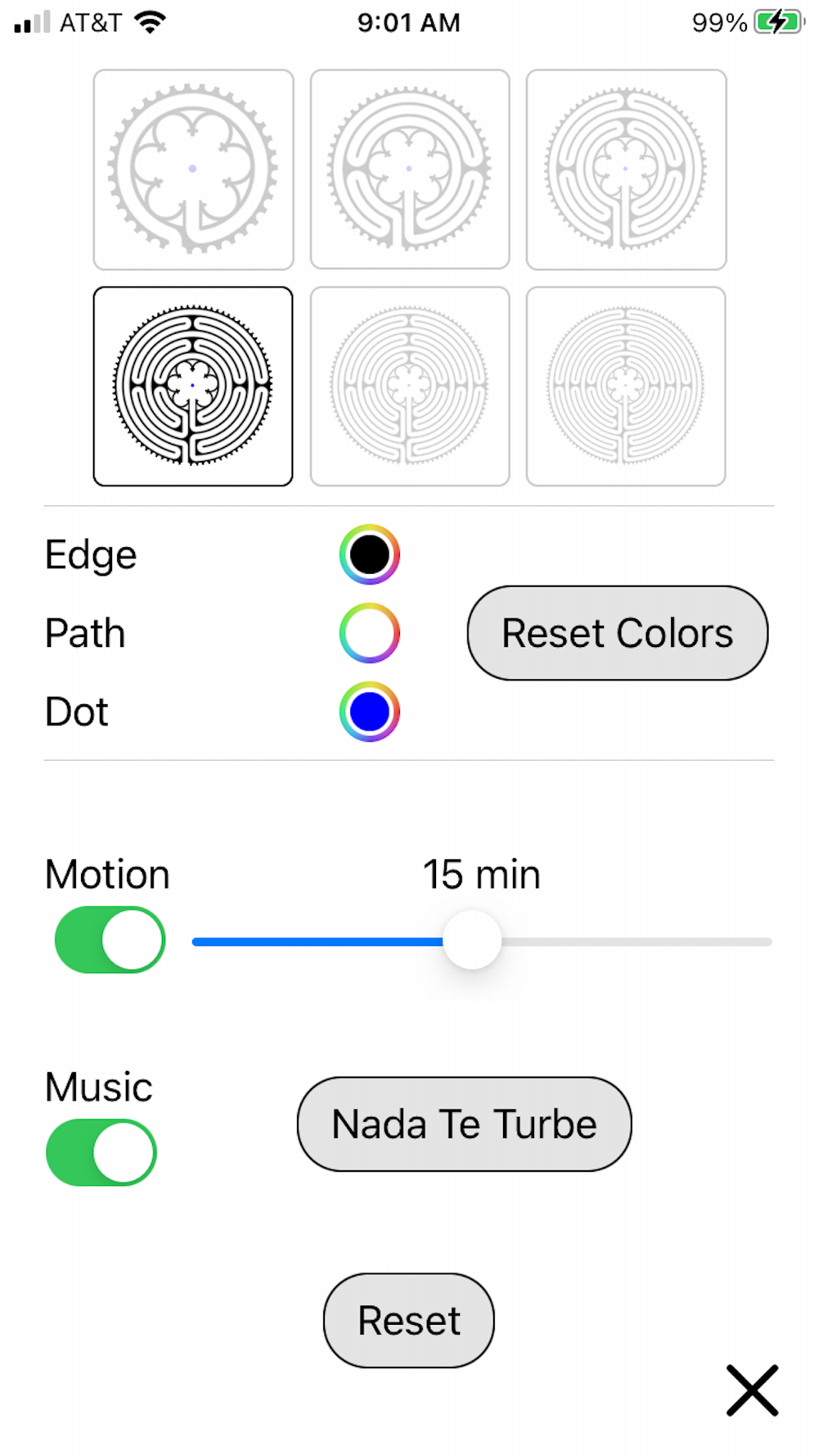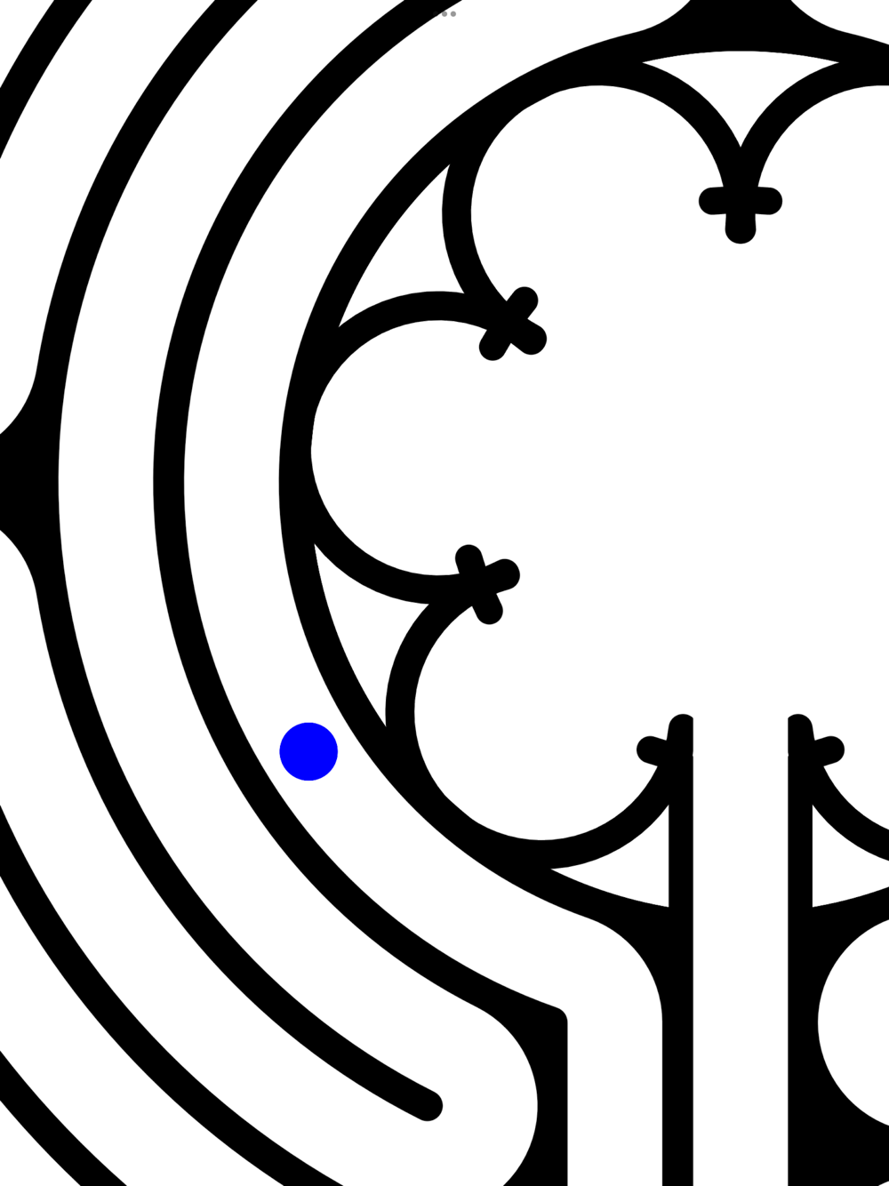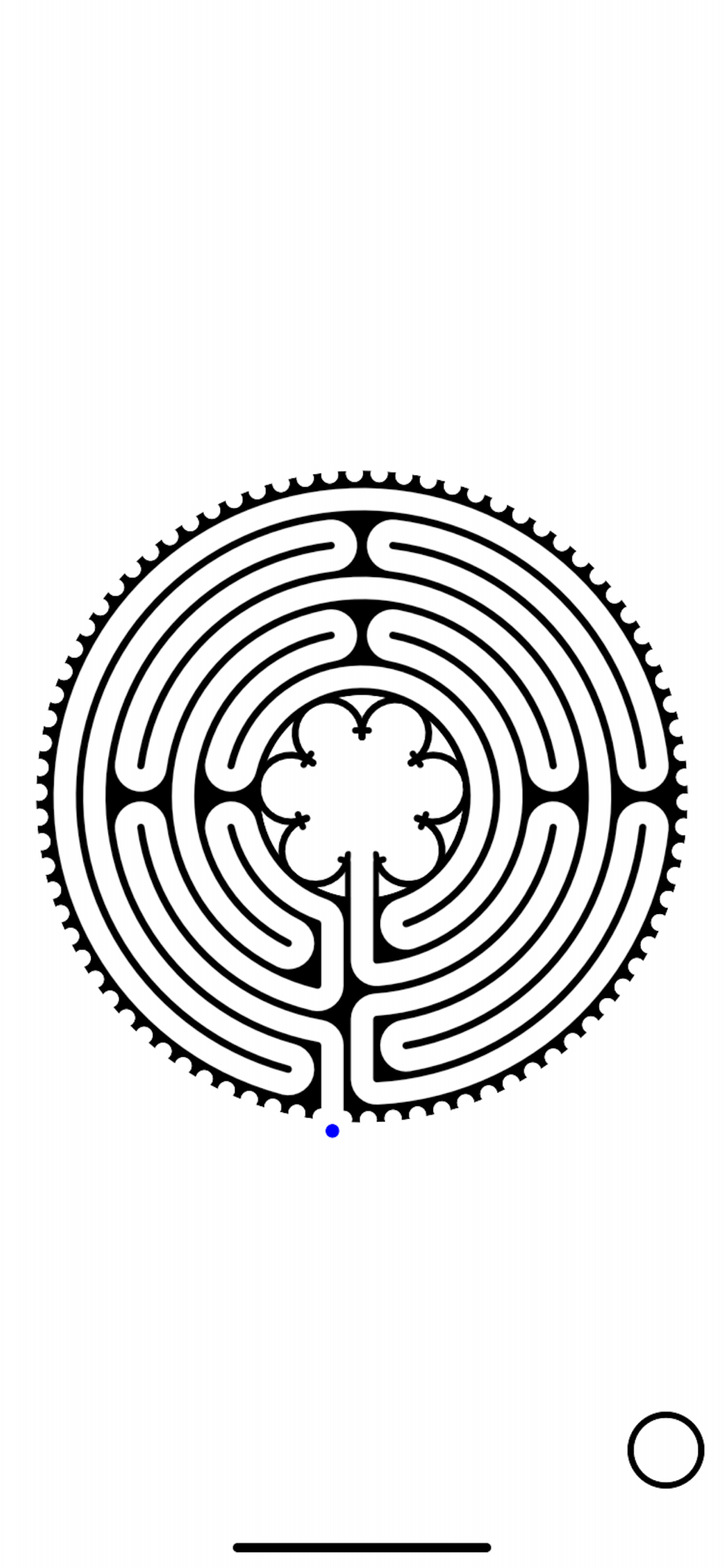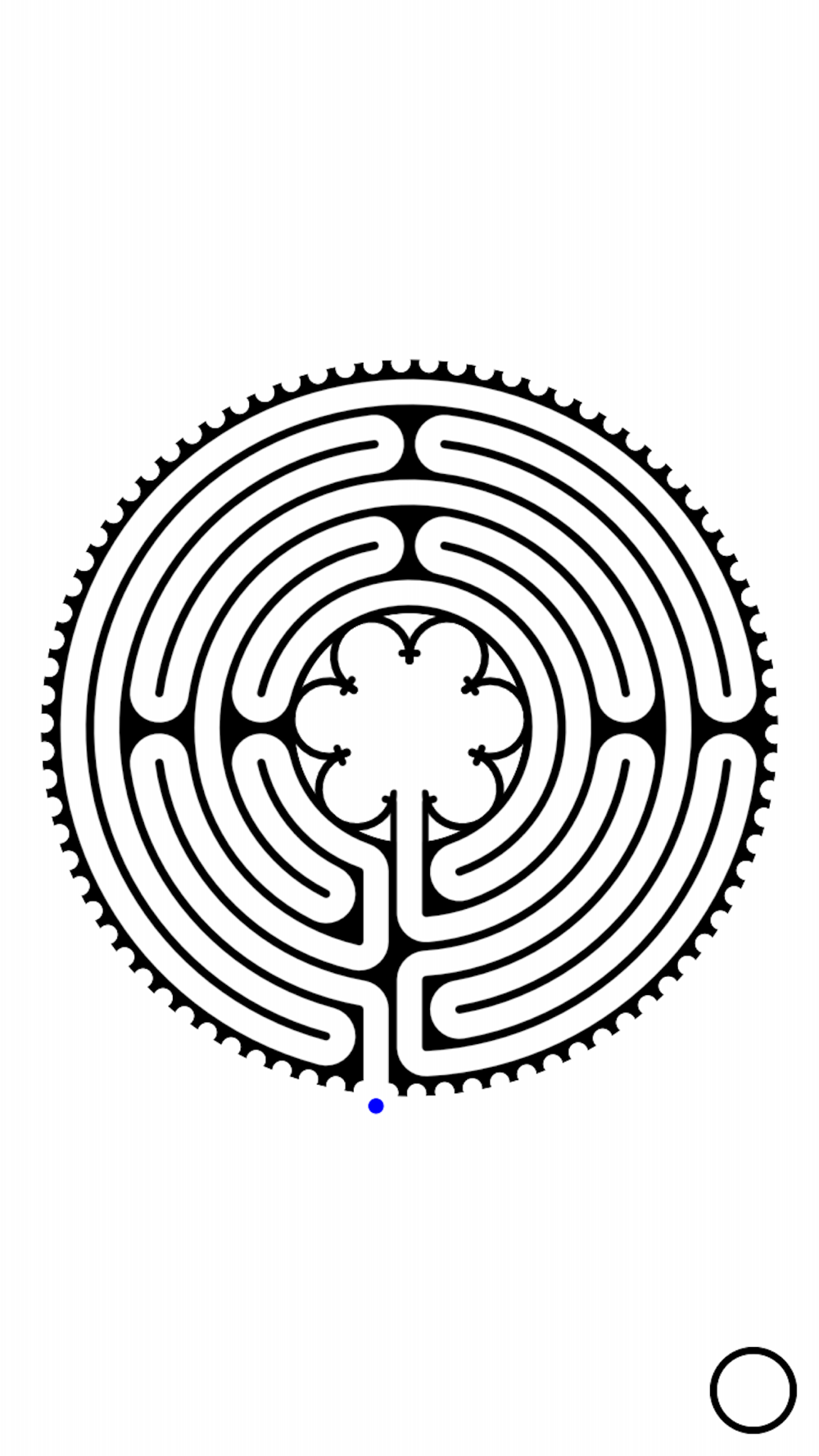 Using pinch gestures, you can zoom into the design. You may find that this makes it easier to drag the dot. Some people also find that being zoomed in more closely reflects how walking a labyrinth is experienced. Try both ways and see which you prefer. You may also choose to have the dot move along on its own.