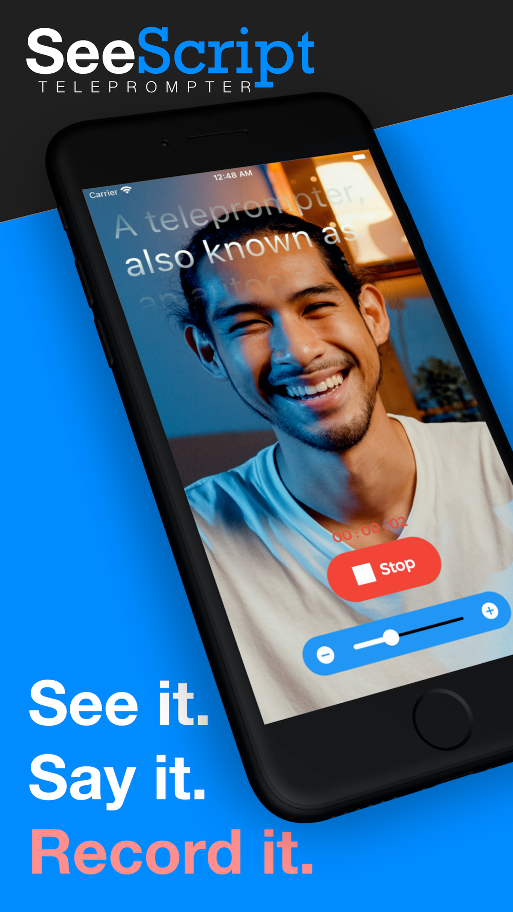 SeeScript is a teleprompter app that helps shoot your videos faster and with less mistakes, while allowing you to look directly at the camera and appear like you have superhuman memory!