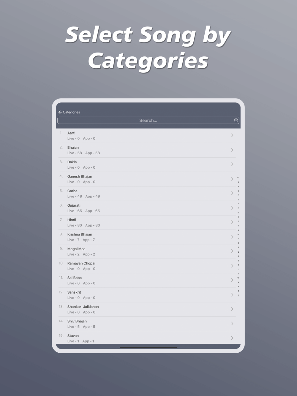 - you can select from bunch of categories, you can also select multiple categories and Either or options so suppose you would like to search songs that should have either one of categories or must have all categories. This feature makes this app unique.