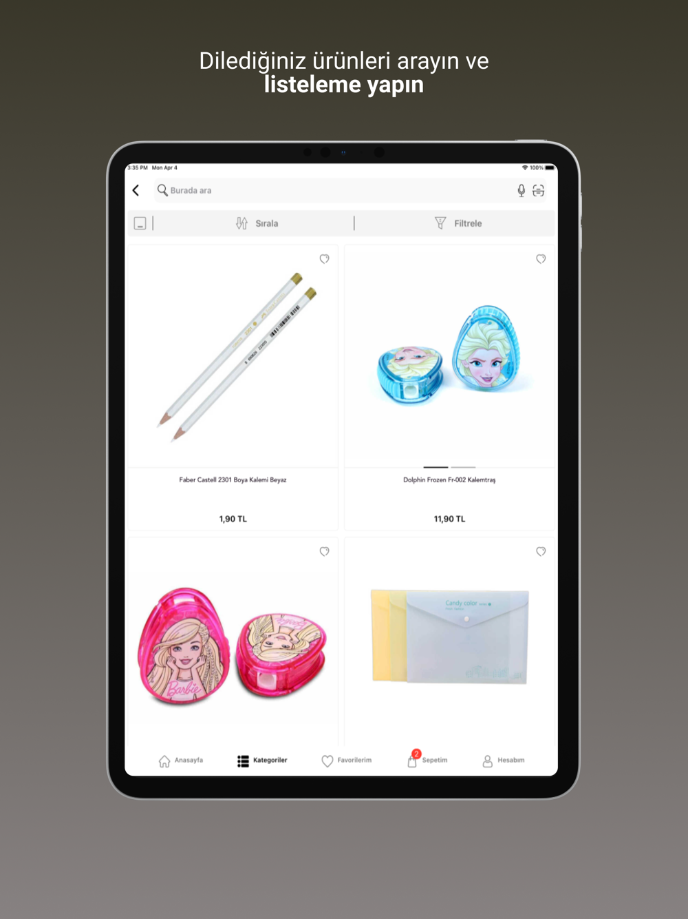 Kırtasiye, ofis malzemeleri, okul alışverişi, fotokopi kağıdı, defter, klasör ve dosya çeşitleri, hijyen ürünleri, yazıcı kartuşları, tükenmez kalemler, boya kalemleri, kurşun kalemler, şeffaf dosya, zarf, kalemtıraş, silgi, pilot kalemler, ince uçlu kalemler, okul çantaları, ajanda, uçlu kalem, keçeli kalem ve çok daha fazlası.