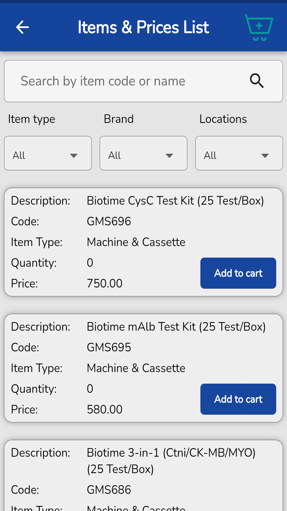 Search for medical and laboratory items and add them into Cart. Checkout and submit your order to one of our Medical Stores or to one of our Sales Representatives for processing. After you submit your order, there will be list of Quotations you can use to reorder items.