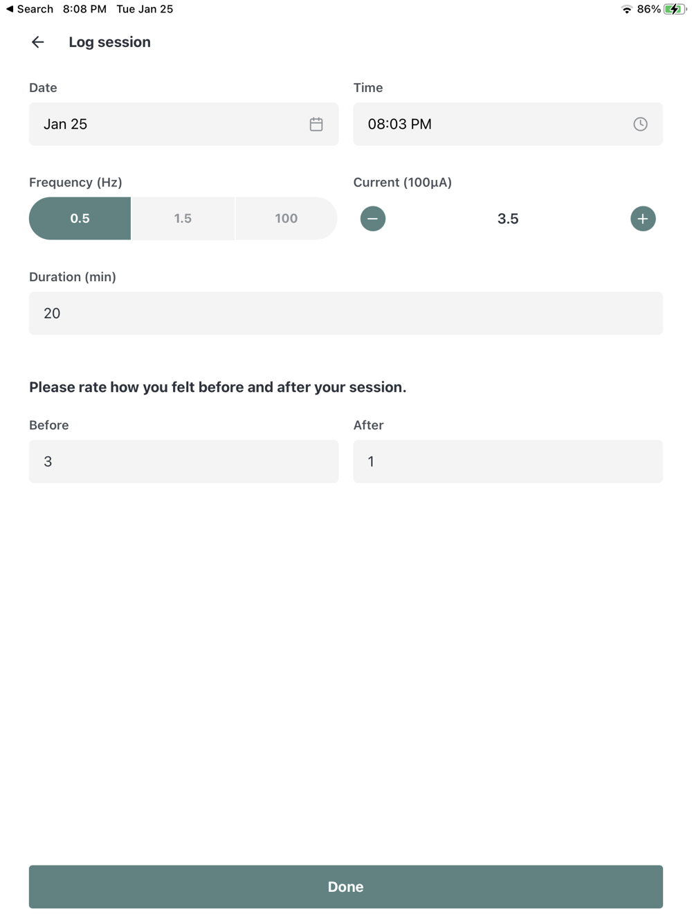 Quickly log the details of your Alpha-Stim sessions, such as date, time, and current level, and rate how you felt before and after your session. Then see which settings gave you the best results, letting you personalize your treatment.
