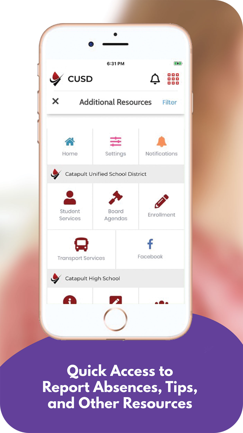 The app includes information for the district and all schools. Filter by the school your child attends to feature information for that school.