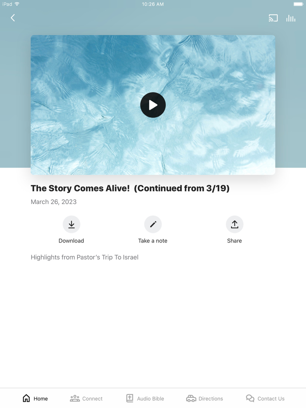 This app will help you stay connected with the day-to-day life of our church. With this app you can: watch or listen to past messages; stay up to date with push notifications; share your favorite messages via Twitter, Facebook, or email; and download messages for offline listening.
