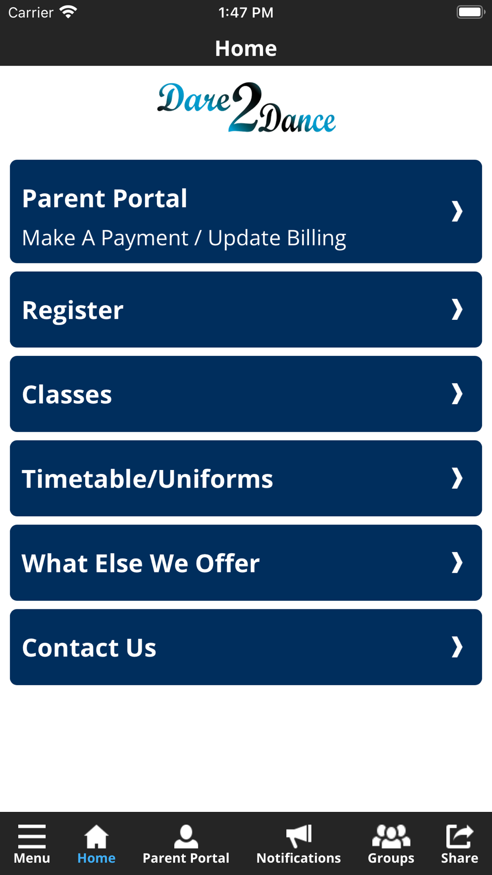 The Dare 2 Dance app allows you to manage your account with ease, see your child's dance schedule, access all the info you need at the touch of a button, pay termly fees, log absences, have access to class music and videos and so much more! You'll also receive important notifications about class changes, registration openings, special announcements, and upcoming events / competitions / concerts.