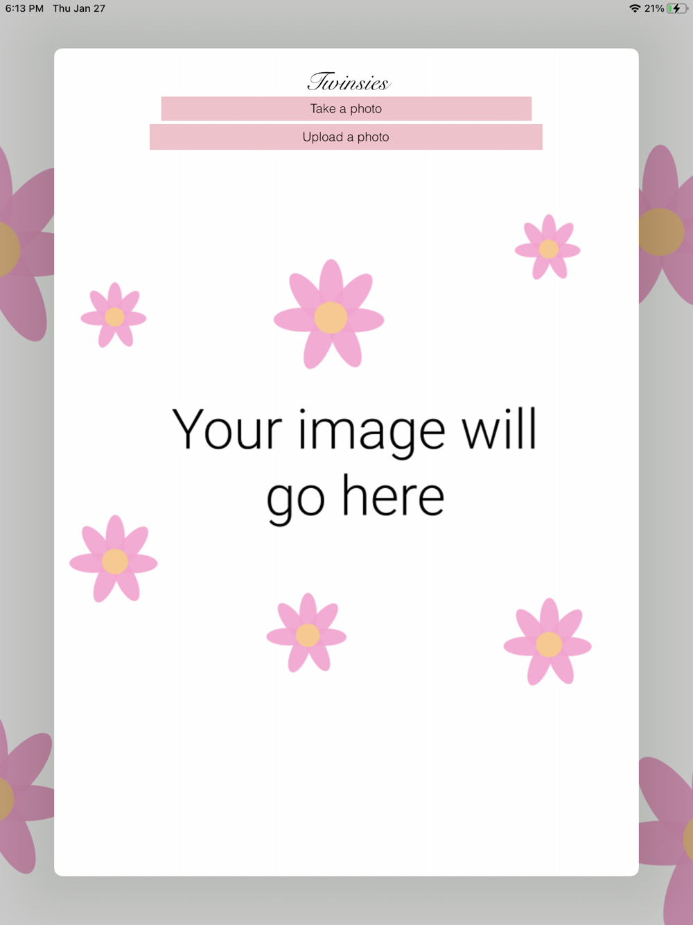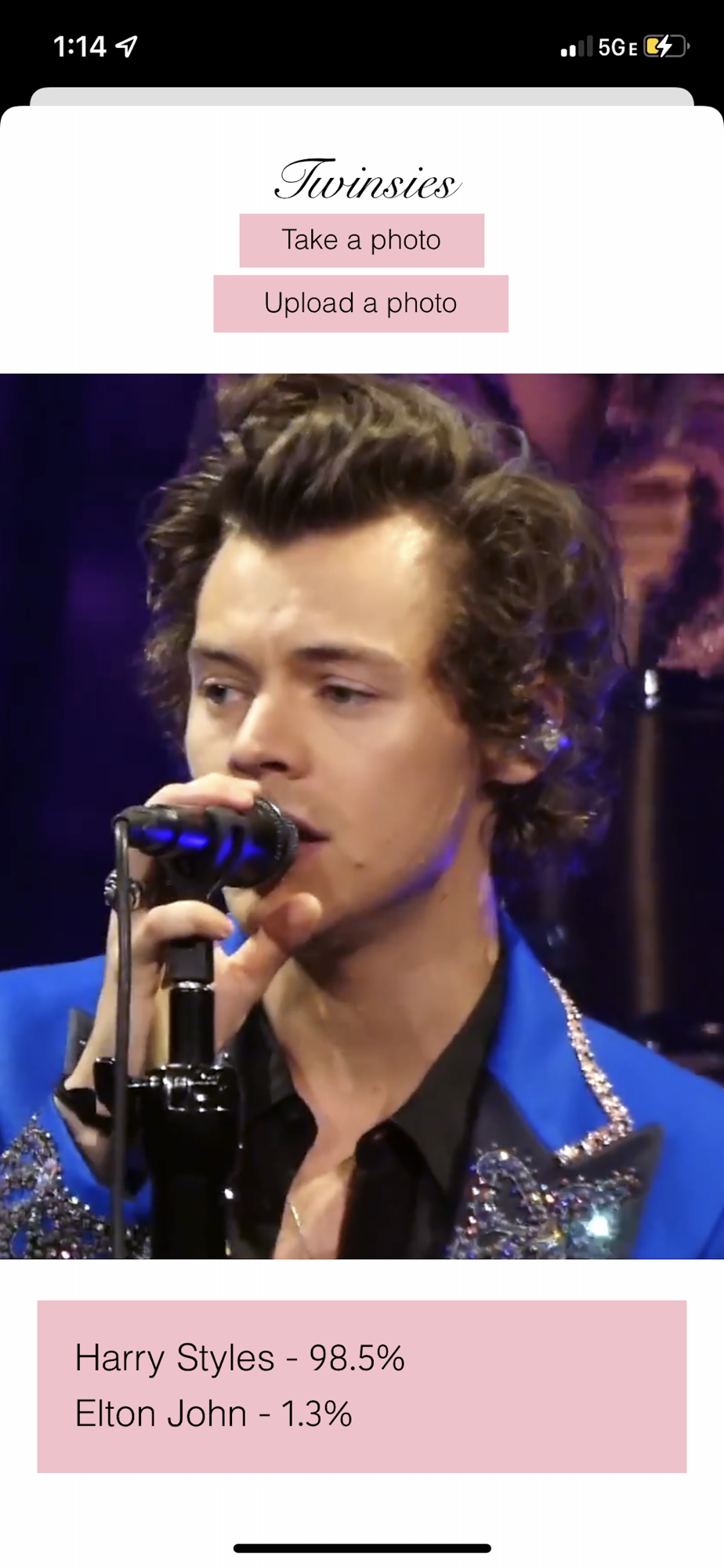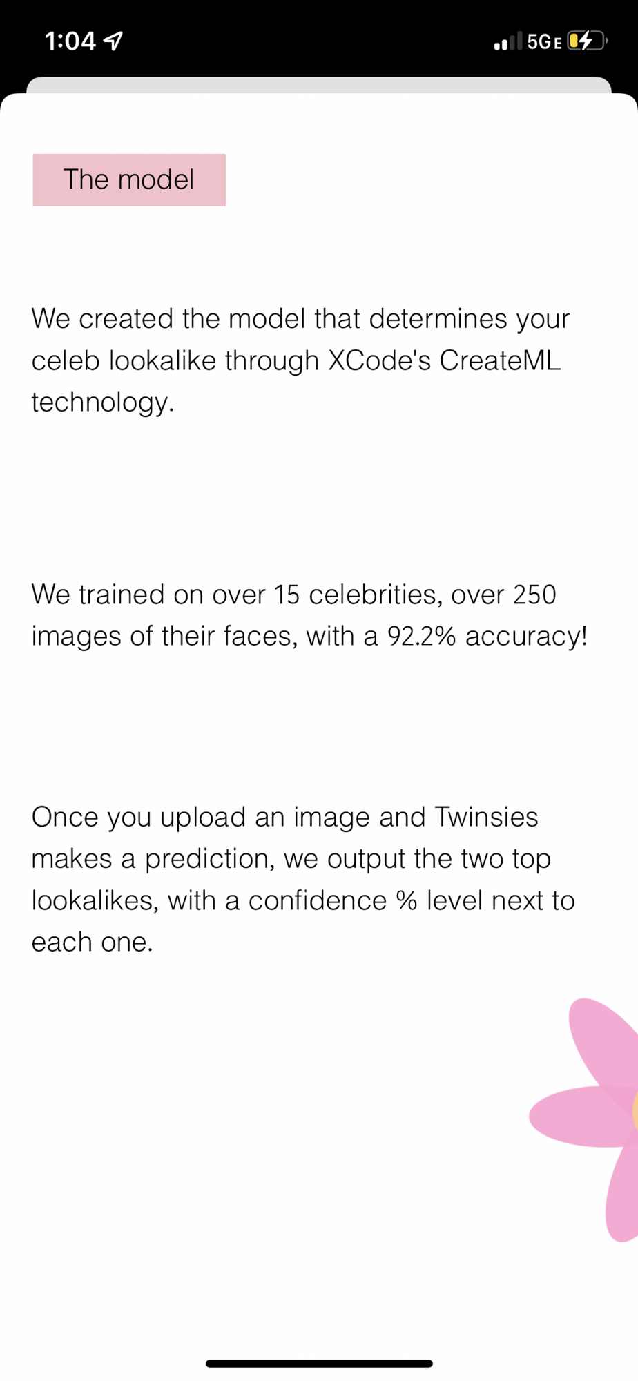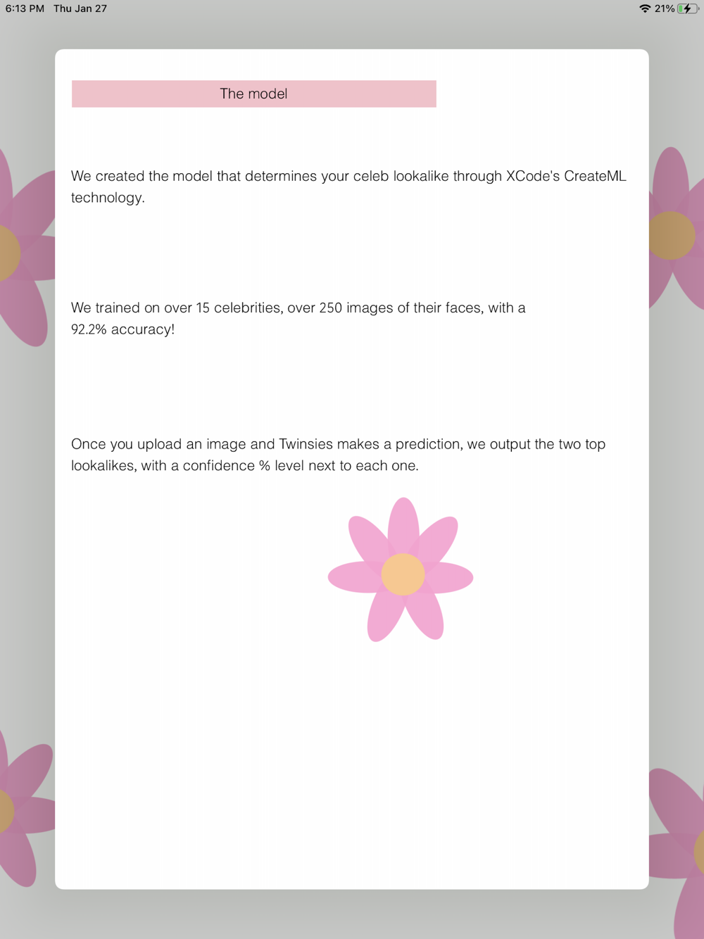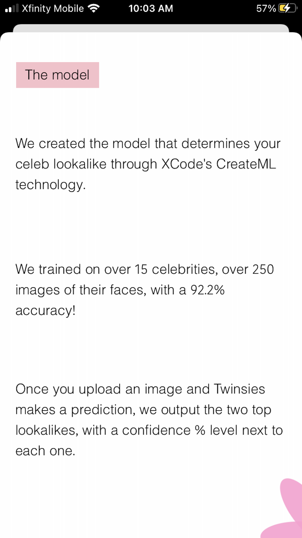 "Twinsies - Celebrity Lookalike" provides a celebrity lookalike based on a given image. The app allows users to either take a photo or upload one from their camera roll and uses image recognition technology to compare the image to its database of celebrity faces! The app displays the photo's top two lookalikes, with a confidence % level next to each prediction (i.e. how confident the algorithm feels that the image looks like the name listed). Want to see what famous face you resemble? Simply click "find your celebrity lookalike!" to find out!