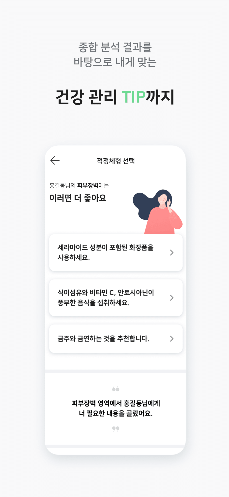 피부/두피, 영양소, 피트니스, 건강검진, 개인특성등 다양한 카테고리에 대한