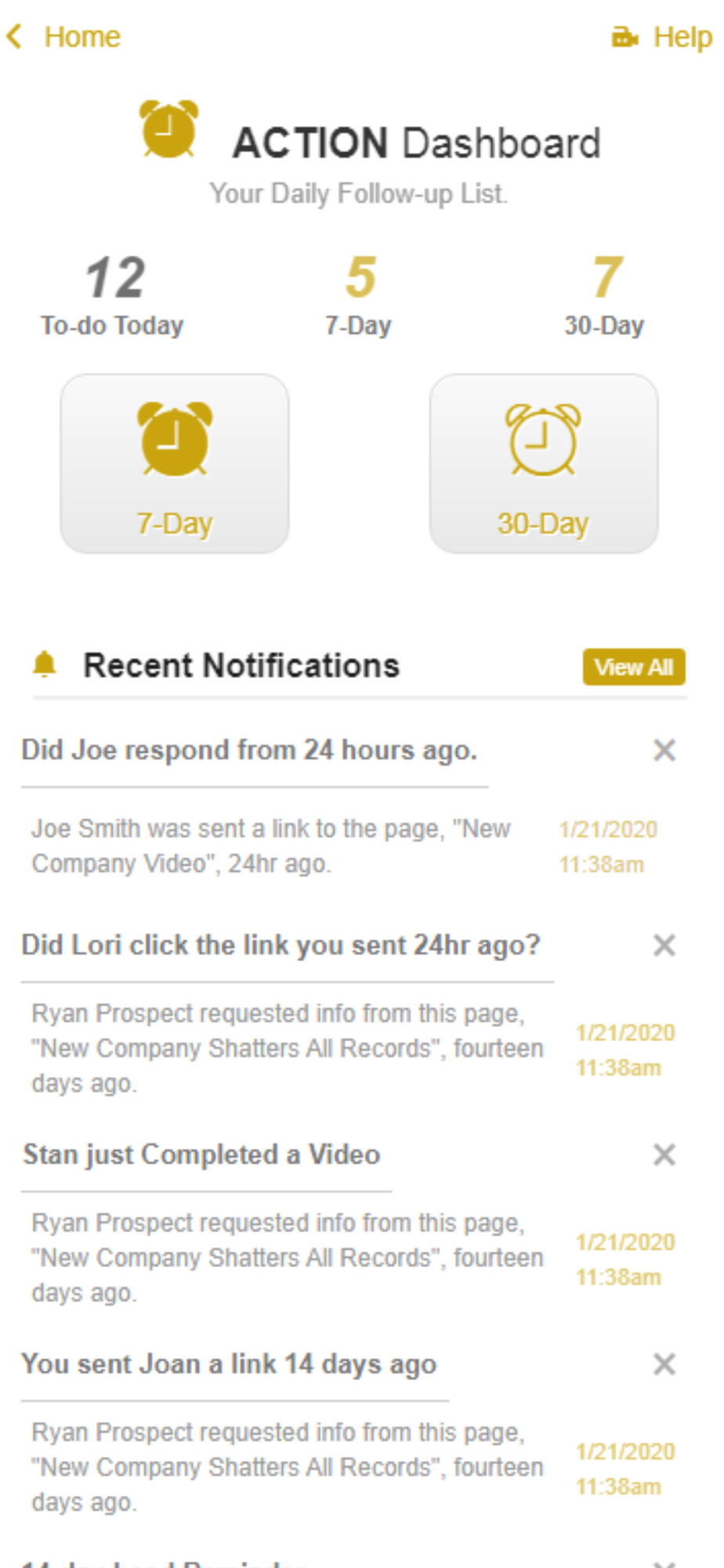 Name, Email, Phone, Prospect Score, Score History, Lead Page, Page Path, Notes, Activity History, Time/Date Stamps, Easily Call, Text, or Email Each Lead with one click.
