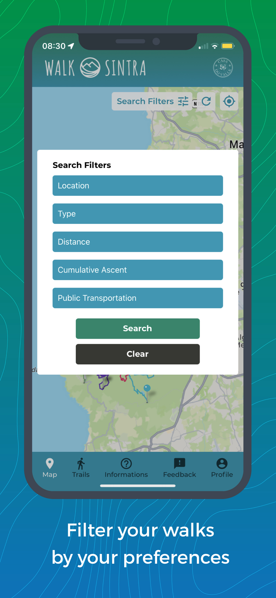 Varied filtering options: You can filter the walks by location, extension, distance, accumulated climb elevation gain, and availability of access via public transportation – and get directions to the starting point of the walks.