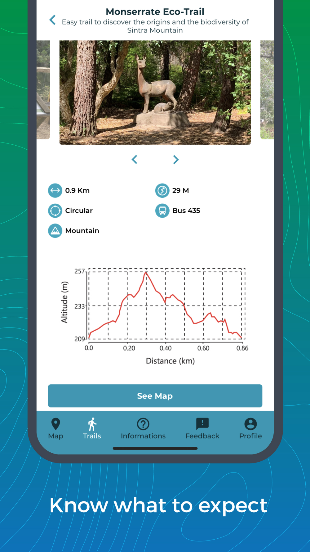 There are other functions, like navigation to the starting point, suggestions of places to visit on the way, as well as the possibility to give us feedback on the trails.