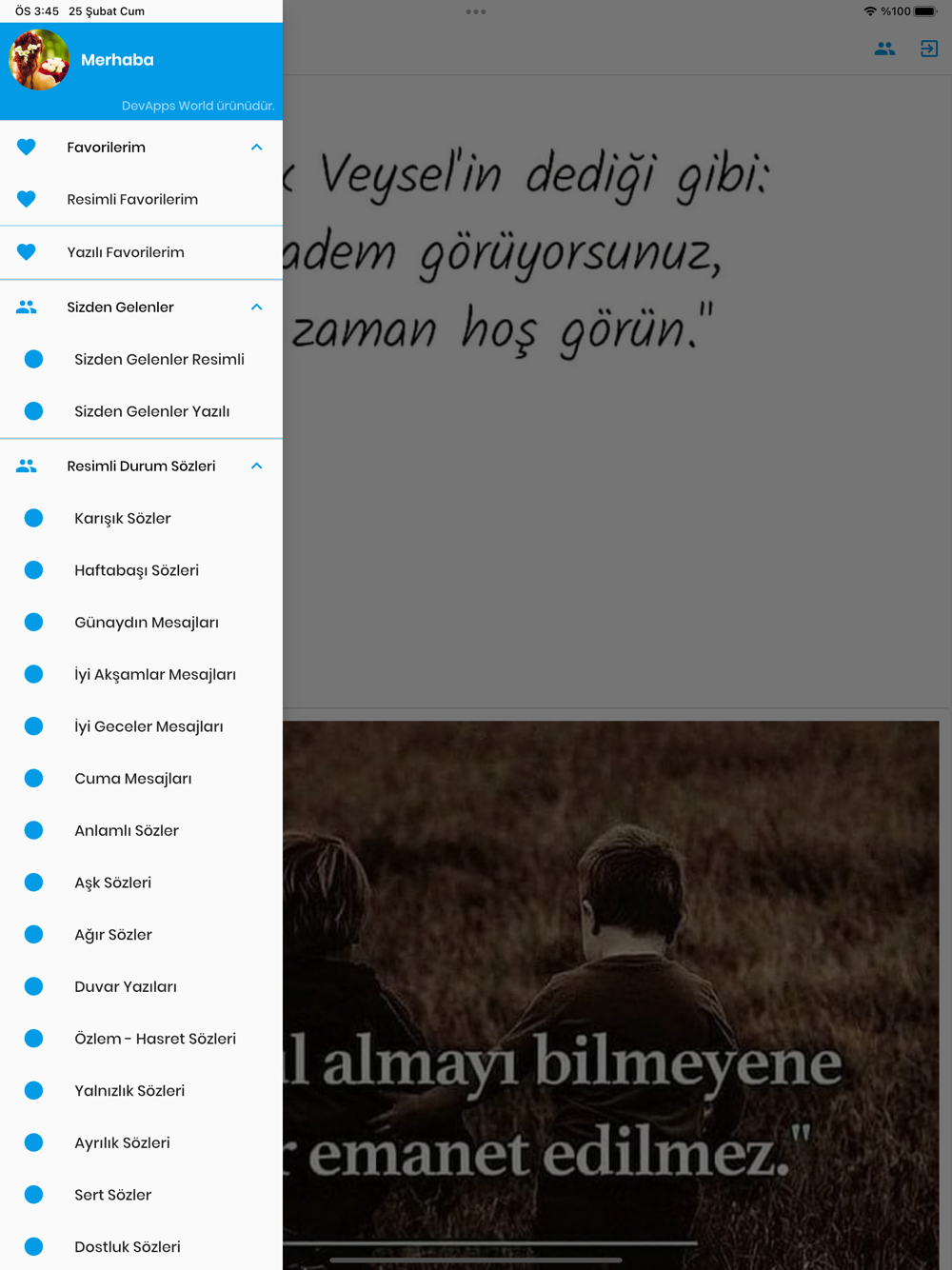 Birbirinden değerli ve özenle seçilmiş sözler onlarca kategoride sizleri bekliyor. İnternet üzerinde söz aramak için uğraşmayın, tek bir uygulama içerisinde onlarca kategoride binlerce sözler. WhatsApp durum sözü ekleyebilir, instagram hikayesine, facebook hikayesine Resimli Durum Sözleri ekleyebilirsiniz.