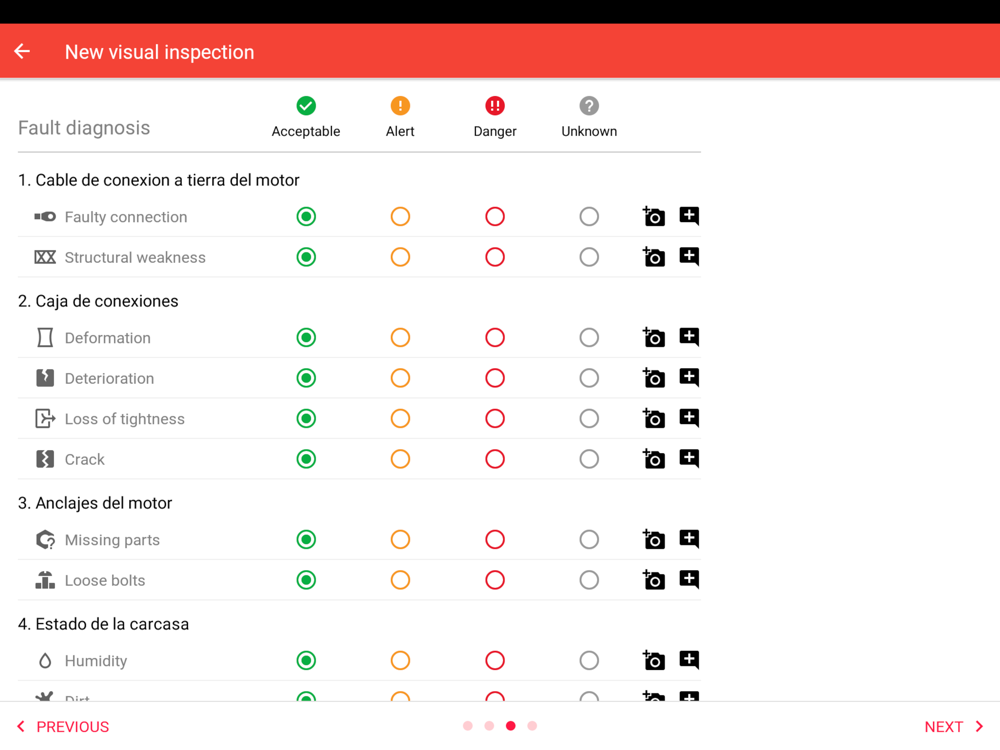 This app allows users to create asset visual inspection reports using a mobile device. Visual inspections can contain measurement values, pictures, a diagnosis of the asset health condition and some recommendations or actions to remedy any potential issues identified.