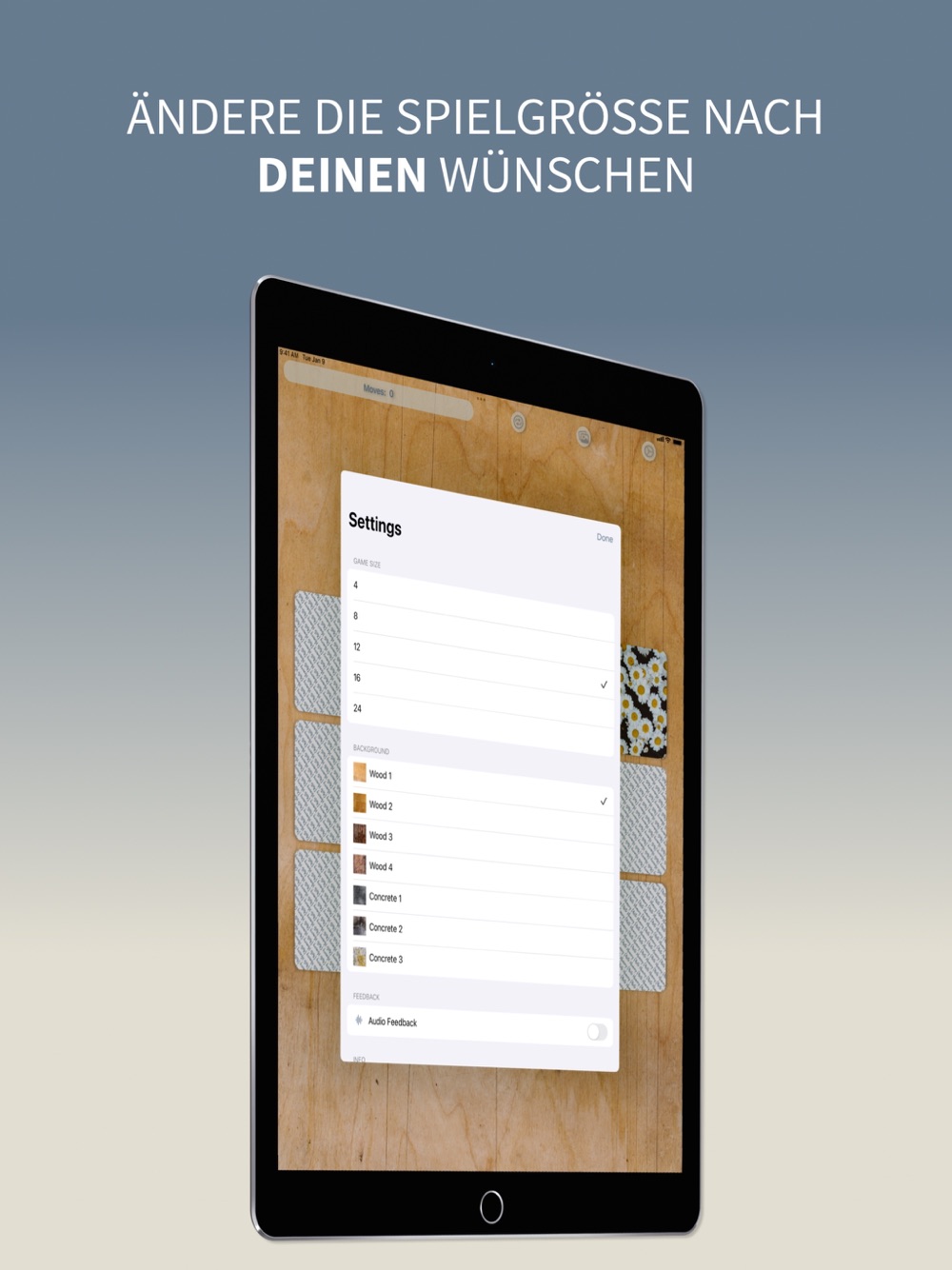 Darüber hinaus kannst du die Größe des Spielfelds bestimmen und aus sieben verschiedenen Hintergründen wählen.