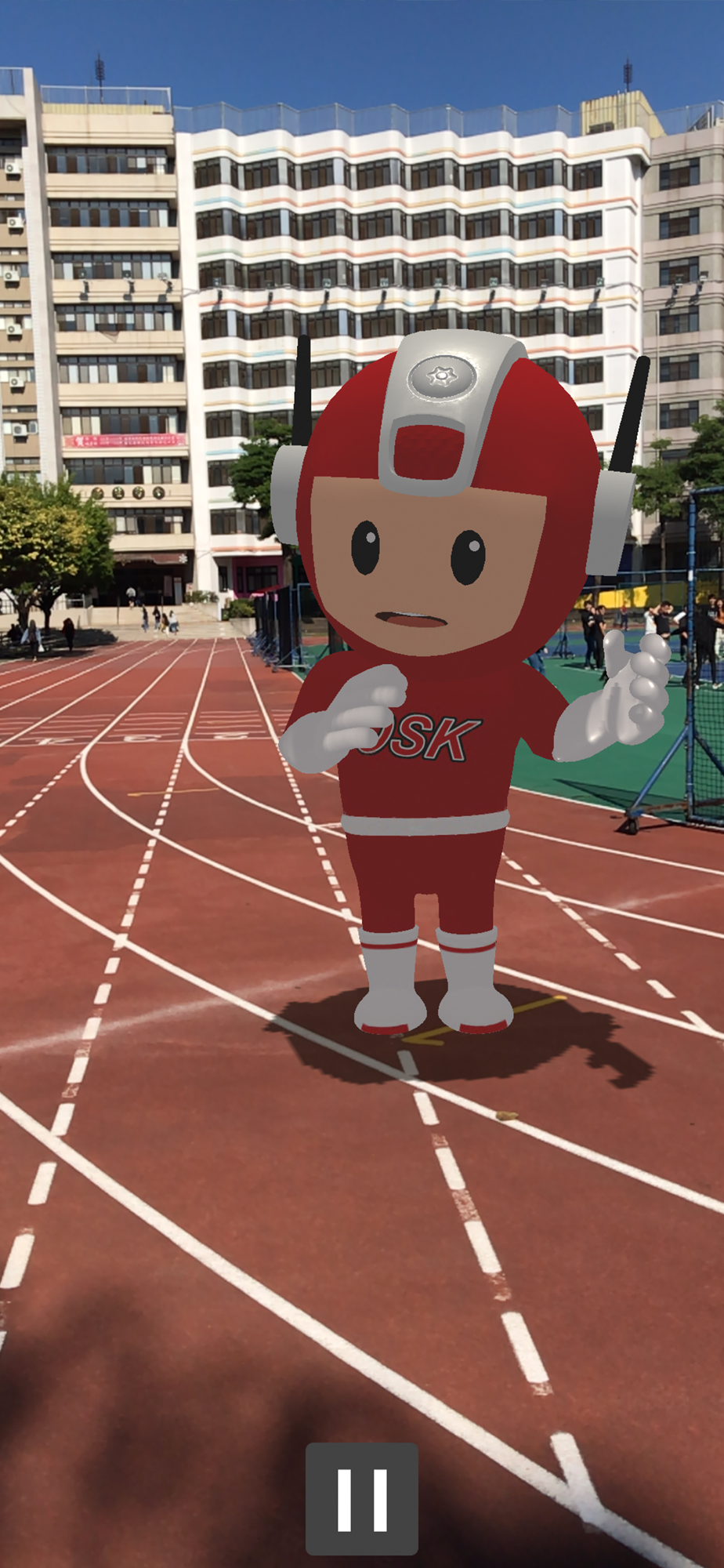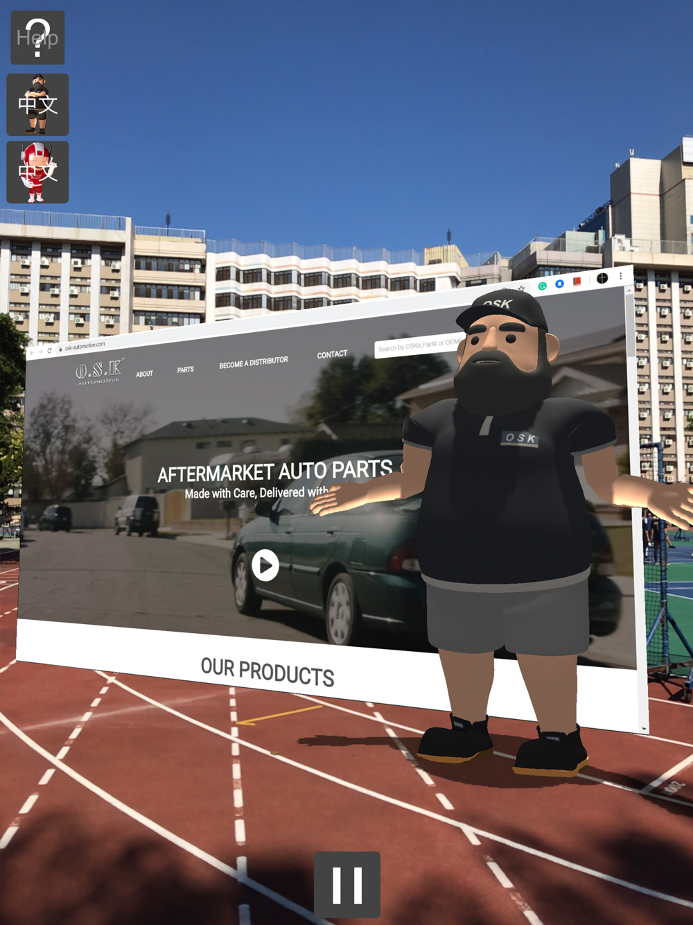 透過這個擴增實境App,可以透過圖卡定位或地面指定呈現虛擬角色,並觀看其介紹 OSK Automotive 公司