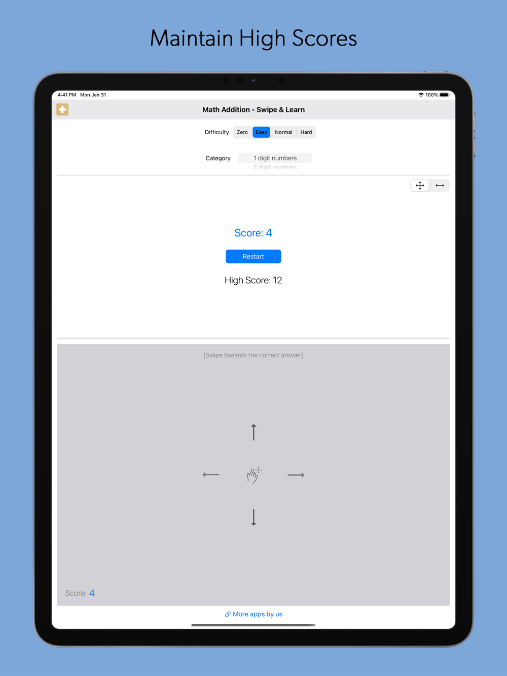 • High scores are maintained for each combination of difficulty level, category and swipe mode
