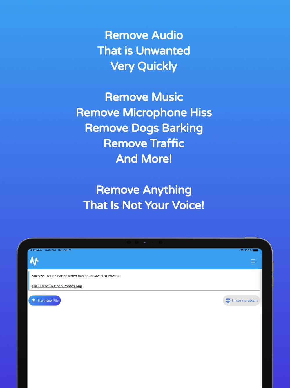 Noise Destroyer is a simple app that allows you to pick an audio or video file and get rid of background noise with just a few taps. It's simple, and powered by a state of the art noise removal engine so your audio is crisp and clean without any background sounds. (It works on pretty much everything but removing background conversation. Other than that it should take care of most background noises!).