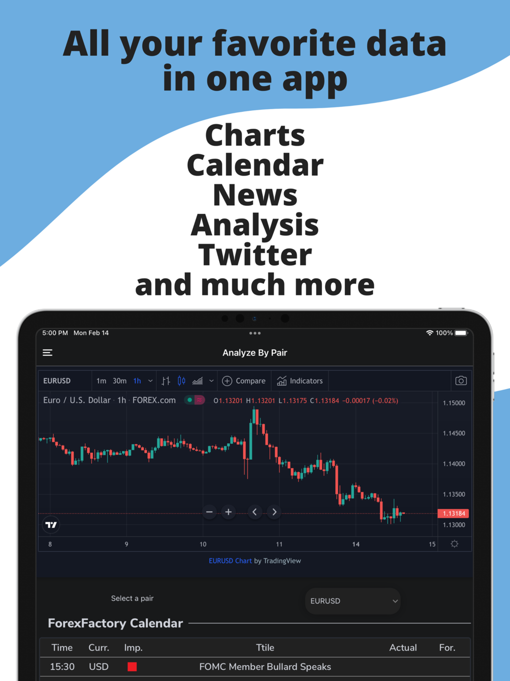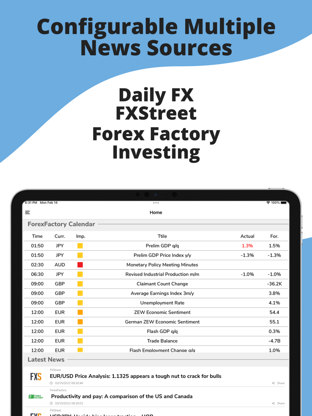 Forex Data helps you with your trading process by gathering all the information you need from your favorite sources into one single application. This simplifies your analysis process because with one scroll you can have a quick look over the forex market status.