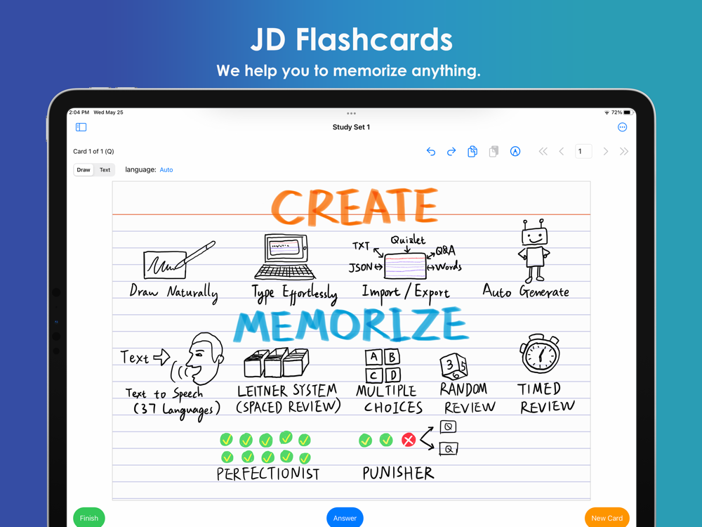 - Many ways to practice: Spaced Repetition (Leitner system), Quick review, Random view, Timed Reviews, Perfectionist, Punisher
