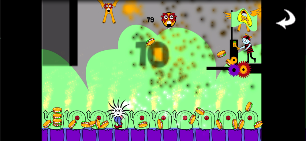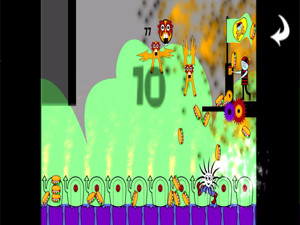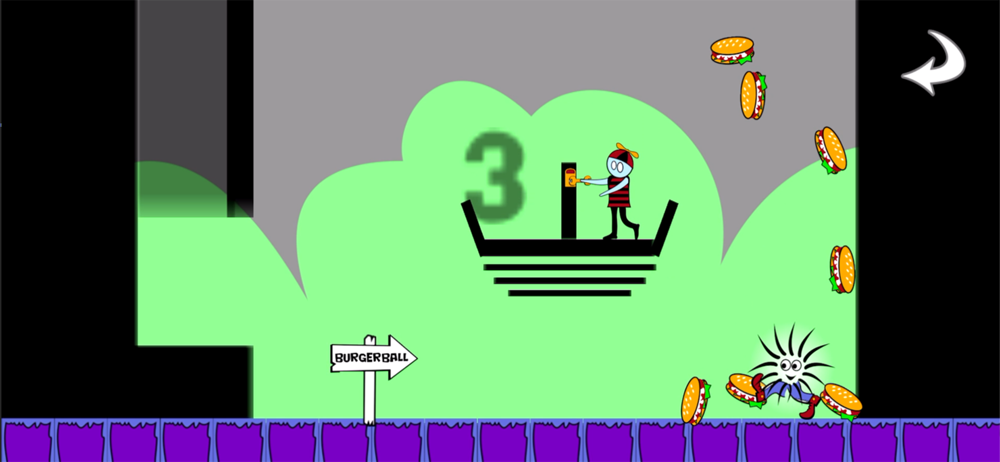 The Great Burger Battle - platformer battle. Run to the right, don't get distracted, stay alive, kick hamburgers, use Podling magic, keep moving!