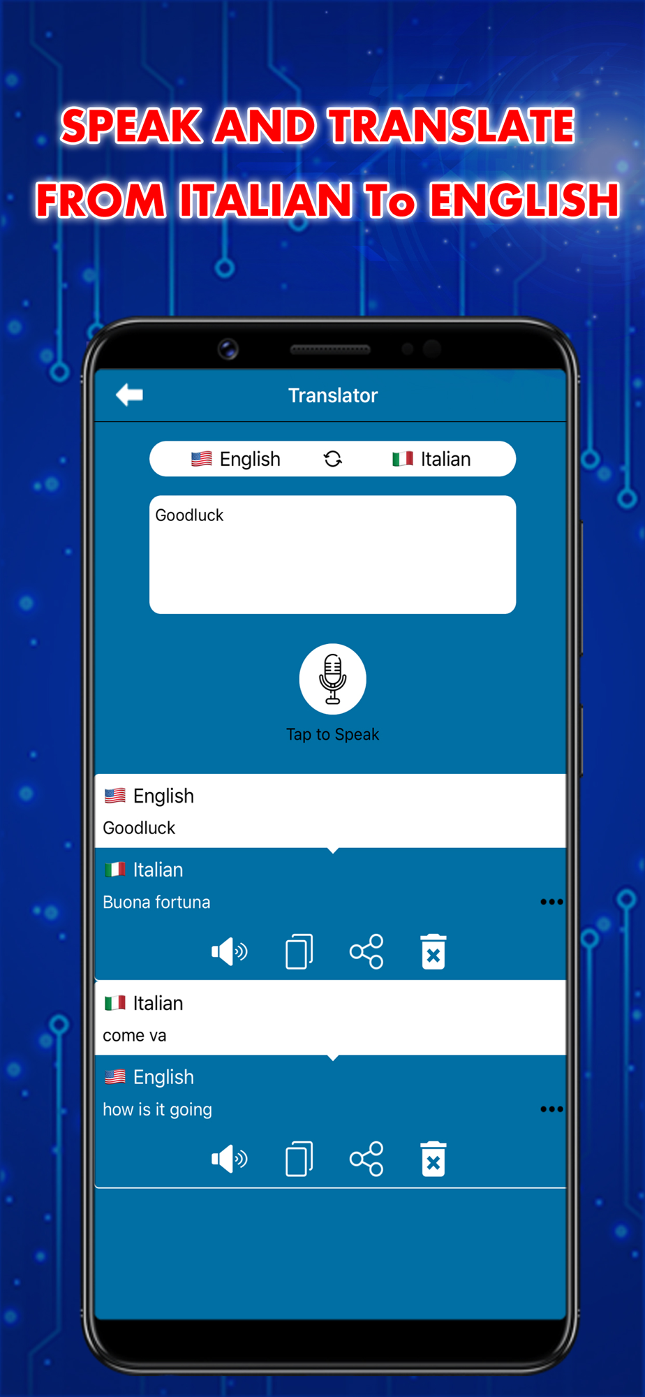 With Speak and Translate in Italian Language you can translate from Italian to English with your voice. Now you can translate anything from English to Italian.