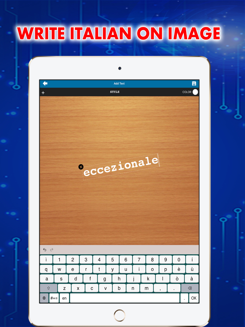 This Italian Keyboard is very easy to use. Install it on your phone make Italian keyboard as default keyboard and there you go. Now type in Italian, Write text on your images in Italian language.