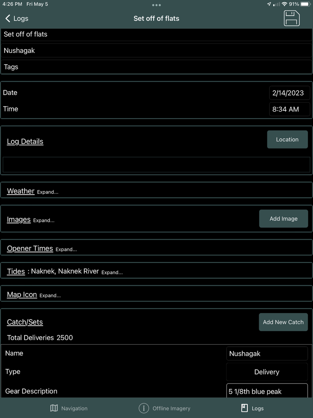 * Log entries for recording opener times, district, pictures, sets/deliveries, and automatic tide/weather history.
