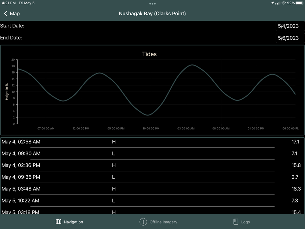 * NOAA tide charts available offline for Bristol Bay tide stations. Other locations downloaded as they are used.