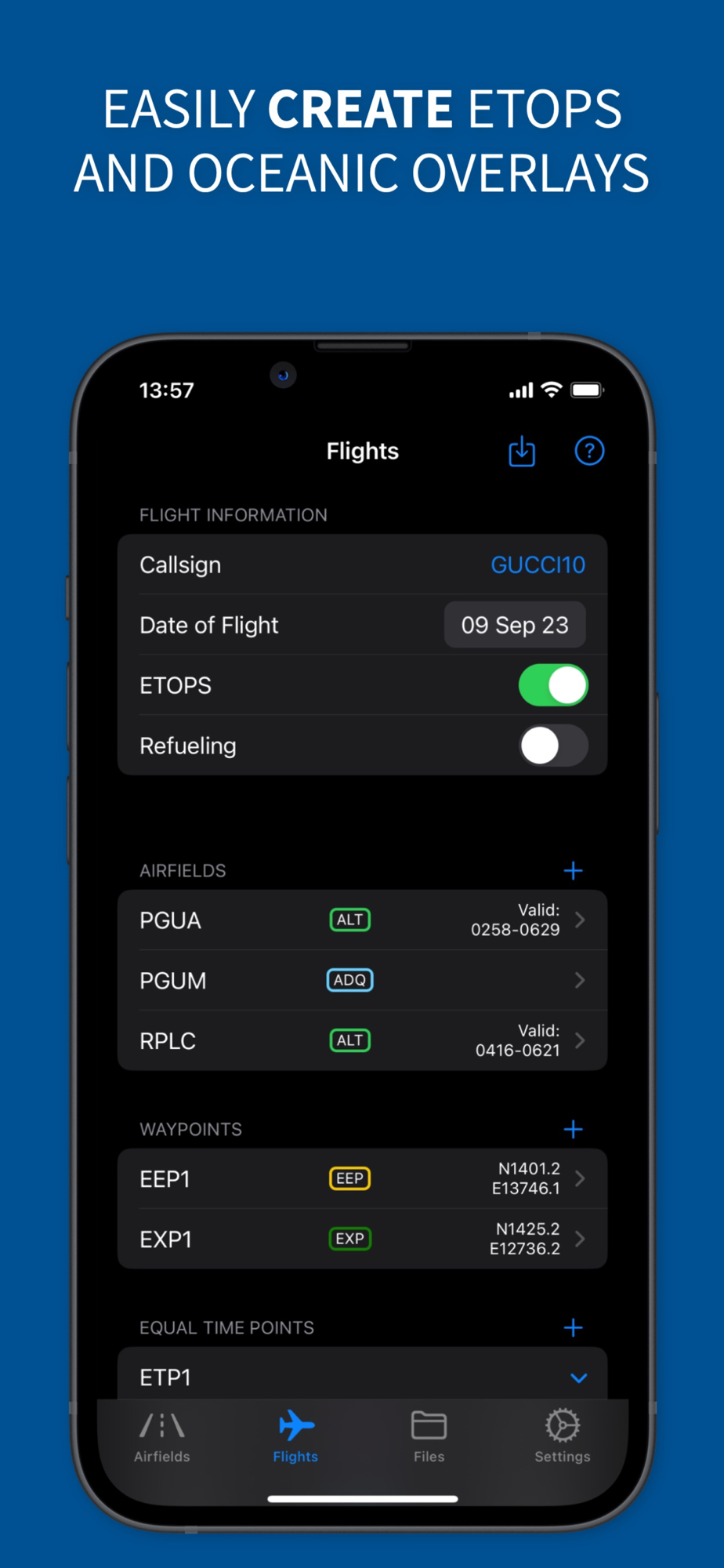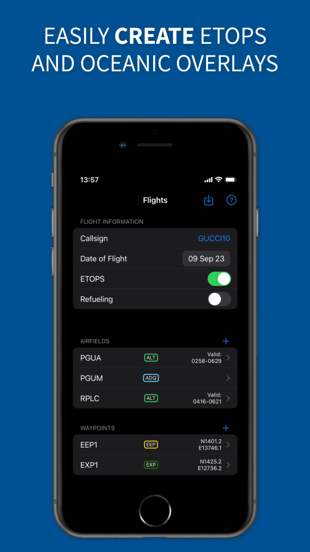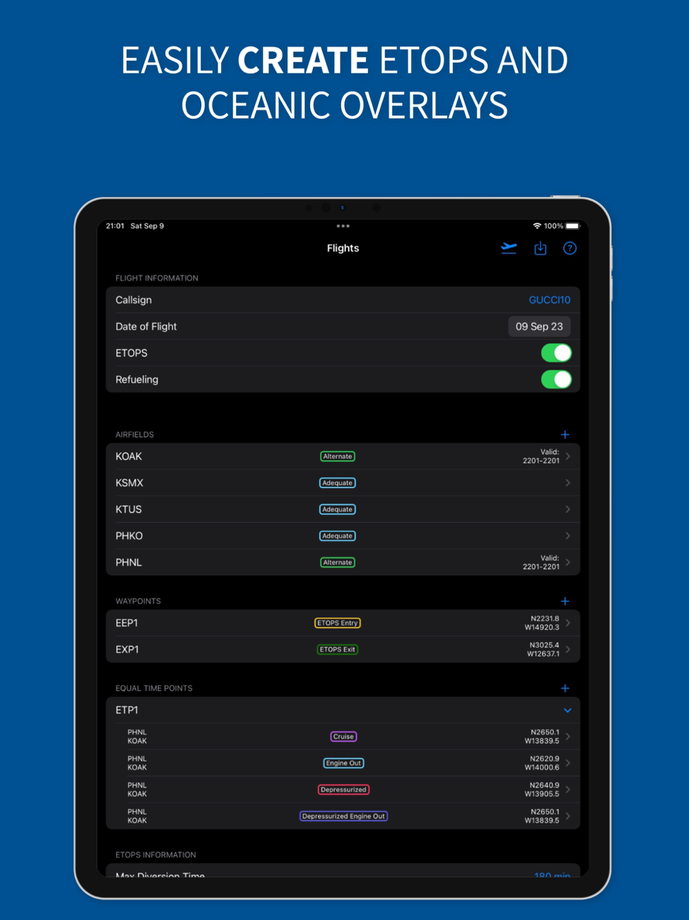 ETOPS Pro is used by flight crews to quickly generate extended operations graphical overlays and other essential flight route overlays for display in ForeFlight Mobile EFB (https://www.foreflight.com).