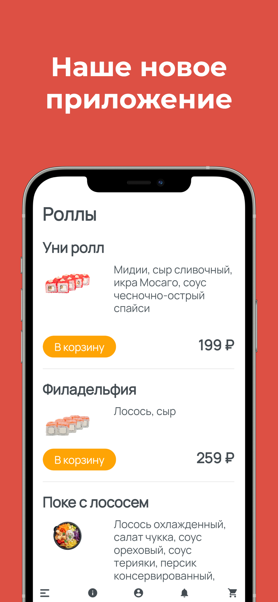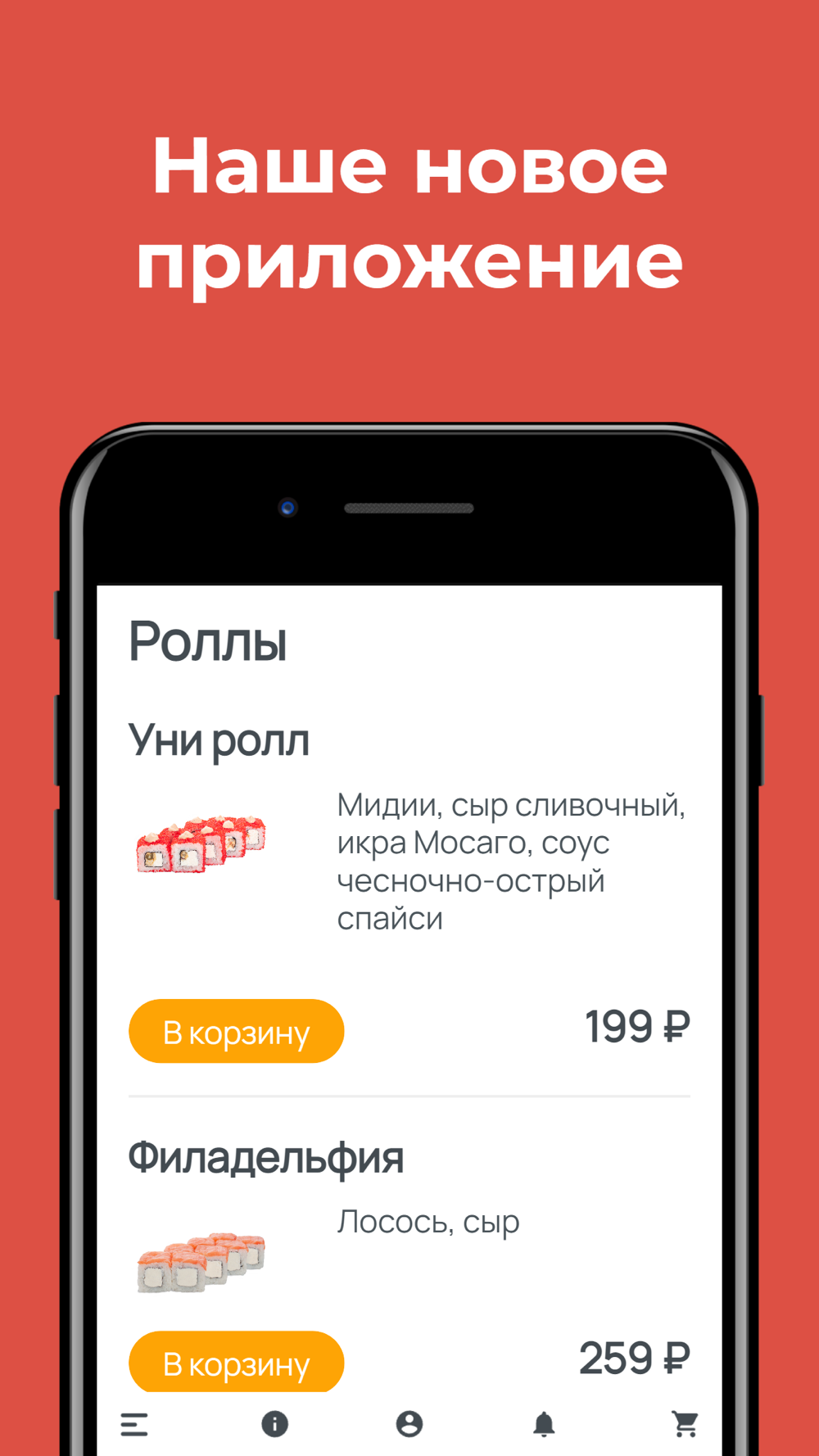 Наше приложение поможет вам быстро и удобно выбрать любимые роллы и оформить заказ! При помощи удобного интерфейса вы сможете легко сориентироваться в меню, в зонах доставки и оформить заказ всего за пару кликов