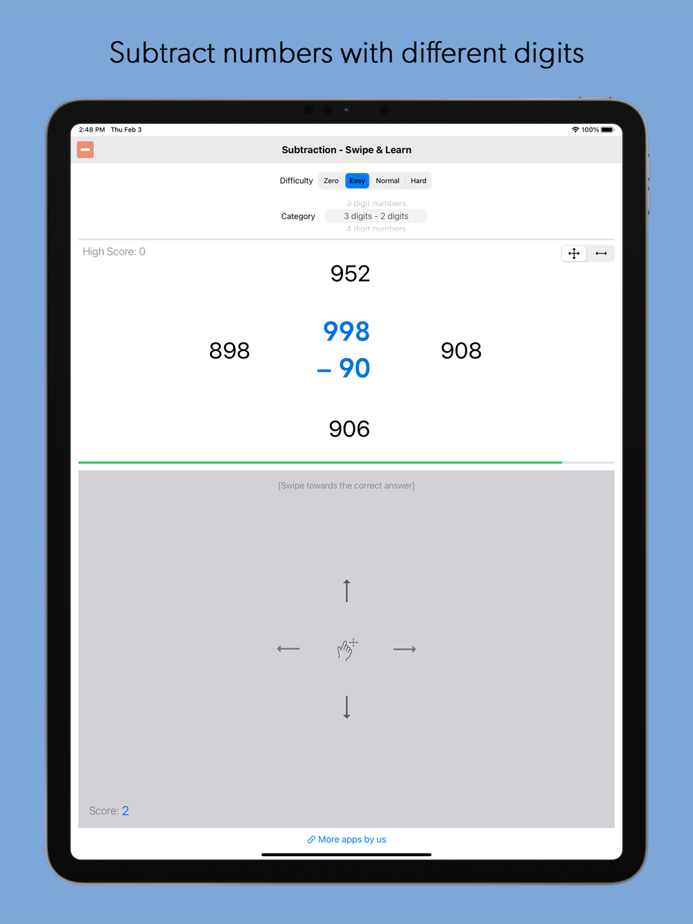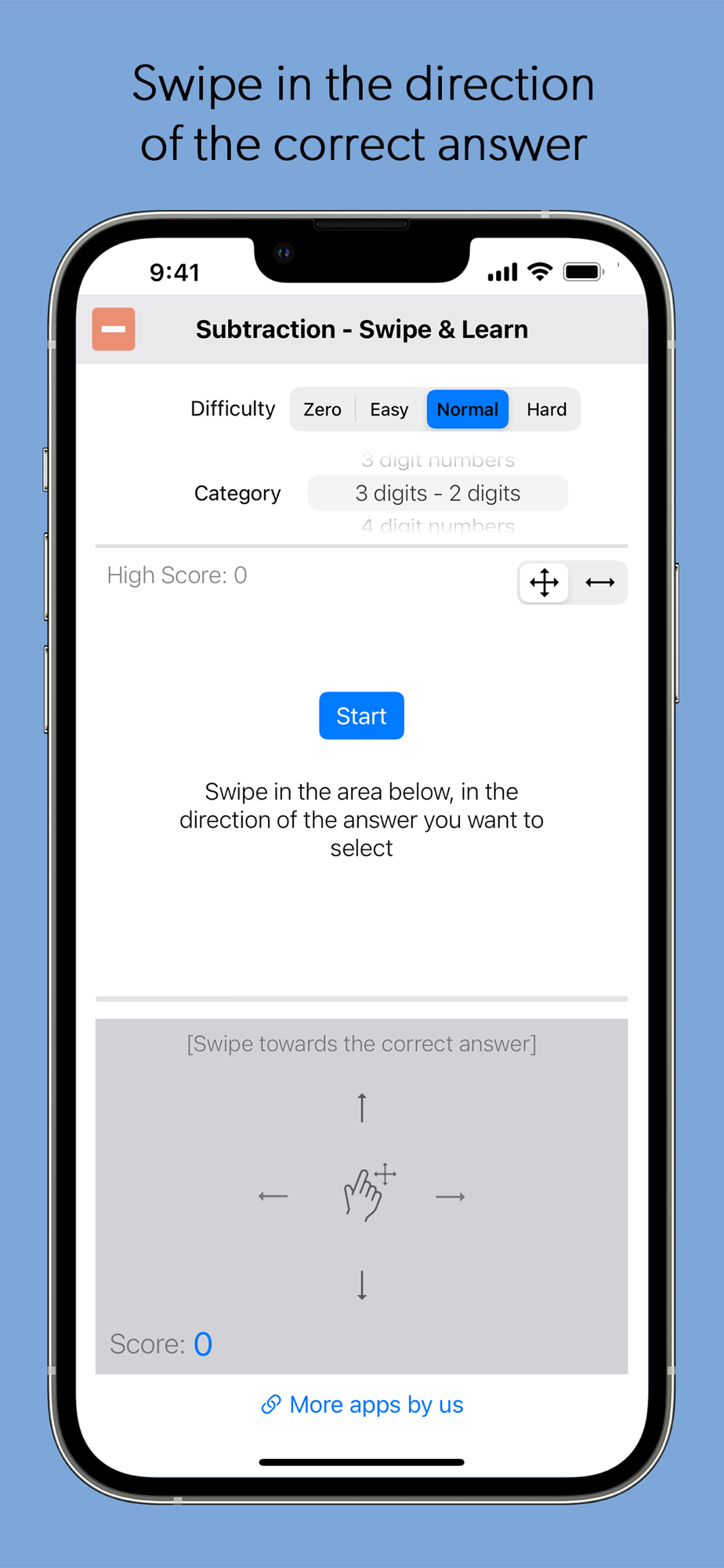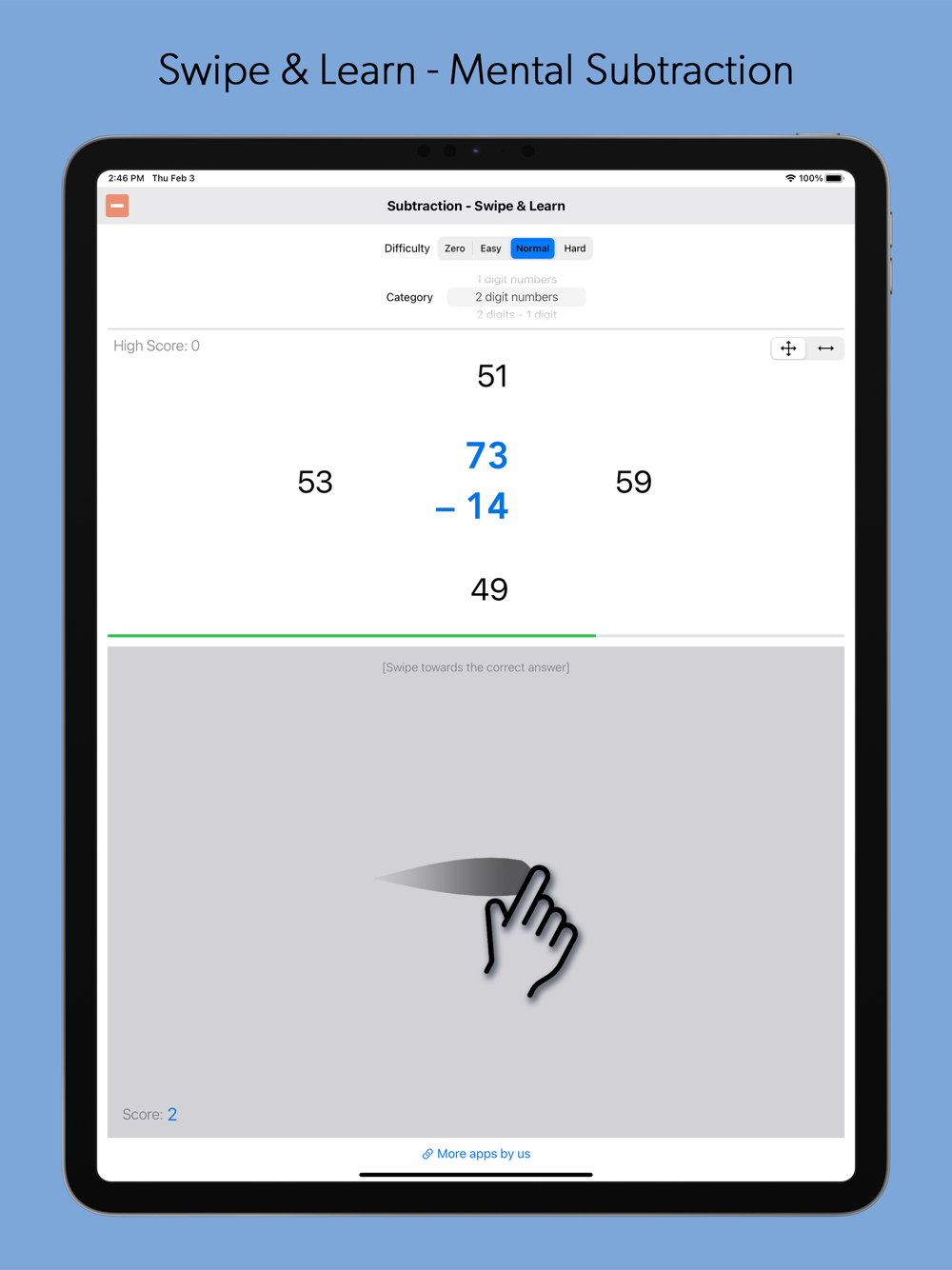 • High scores are maintained for each combination of difficulty level, category and swipe mode