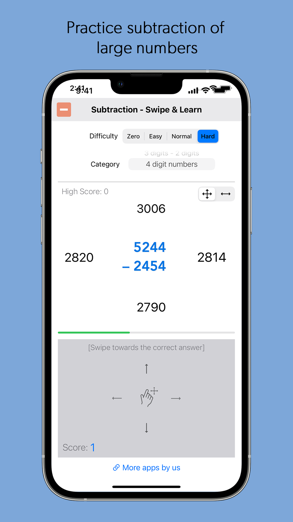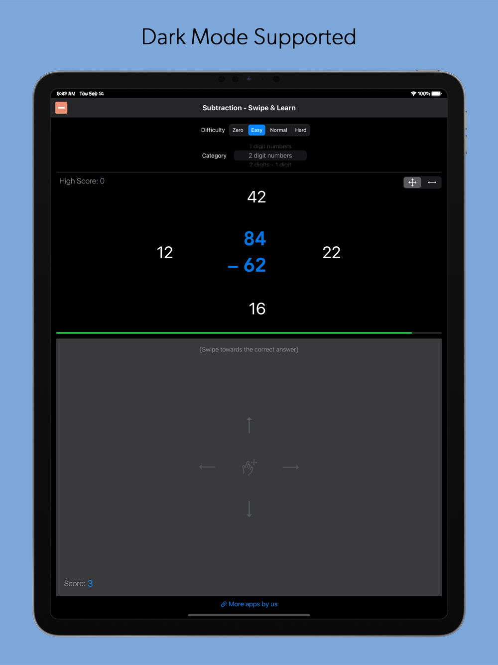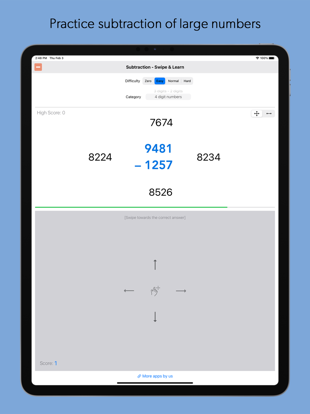 • High scores are maintained for each combination of difficulty level, category and swipe mode