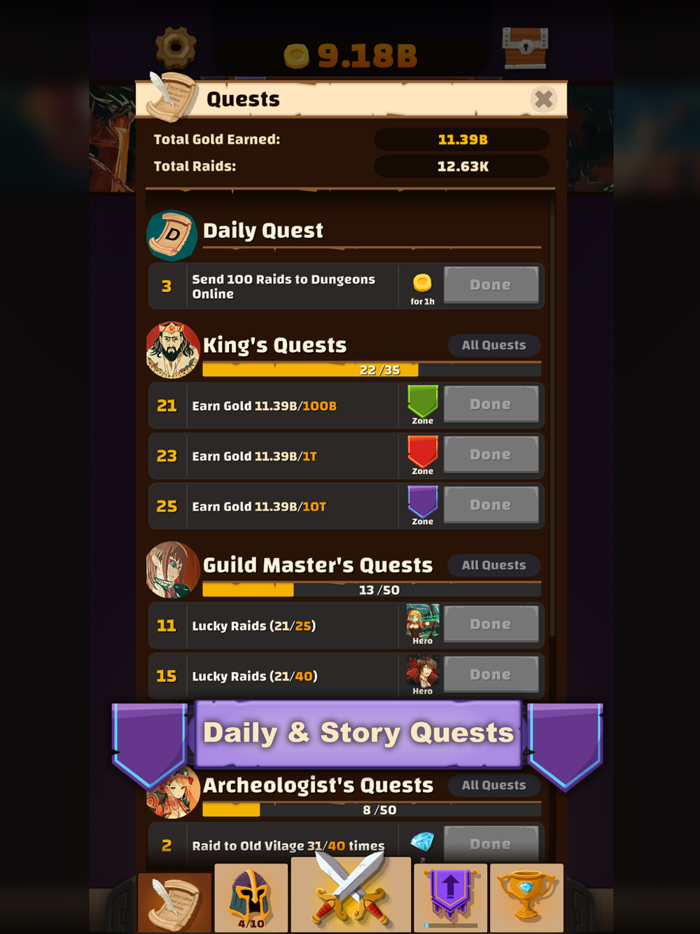 Idle Raids - is the one-man team game where each Hero has chances of income, luck and bad luck in form of a Dice! Manage your team. Choose upgrades wisely. Finish lot of quests and open new maps.
