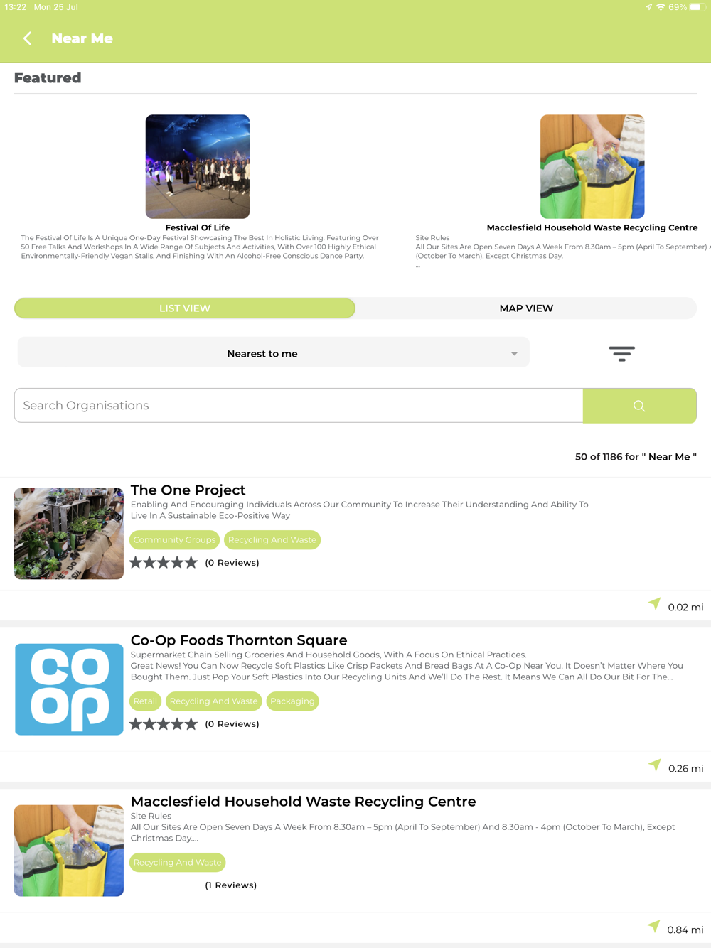 Be able to search locations, organisations, community groups, and events nearby from everything to do with recycling, bio-diversity, green energy, and events like litter picking and urban gathering.