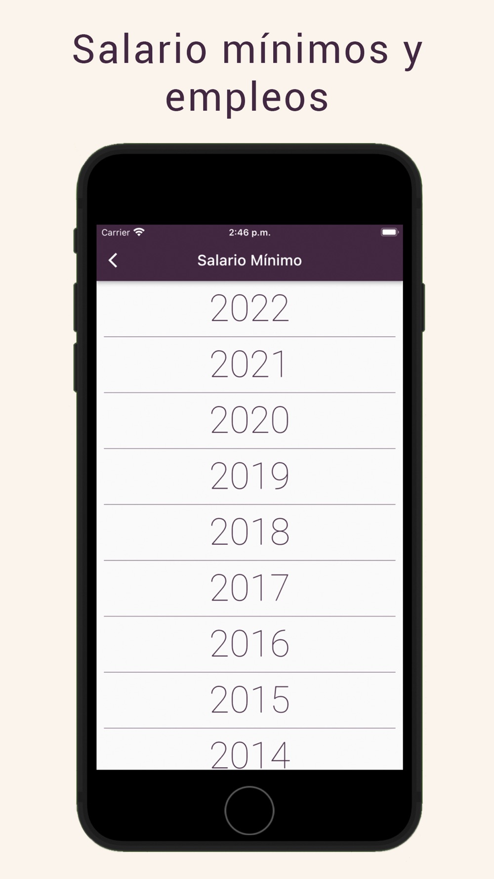 La aplicación contiene los salarios mínimos desde 1992 hasta el año actual, con los oficios, zonas geográficas y los cambios de salario por cada año.