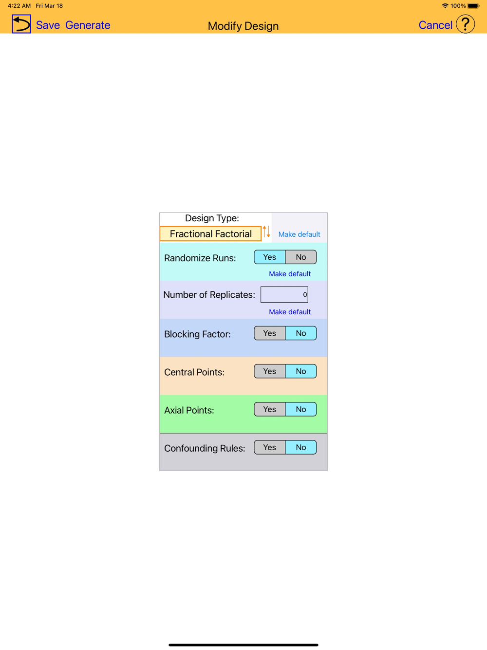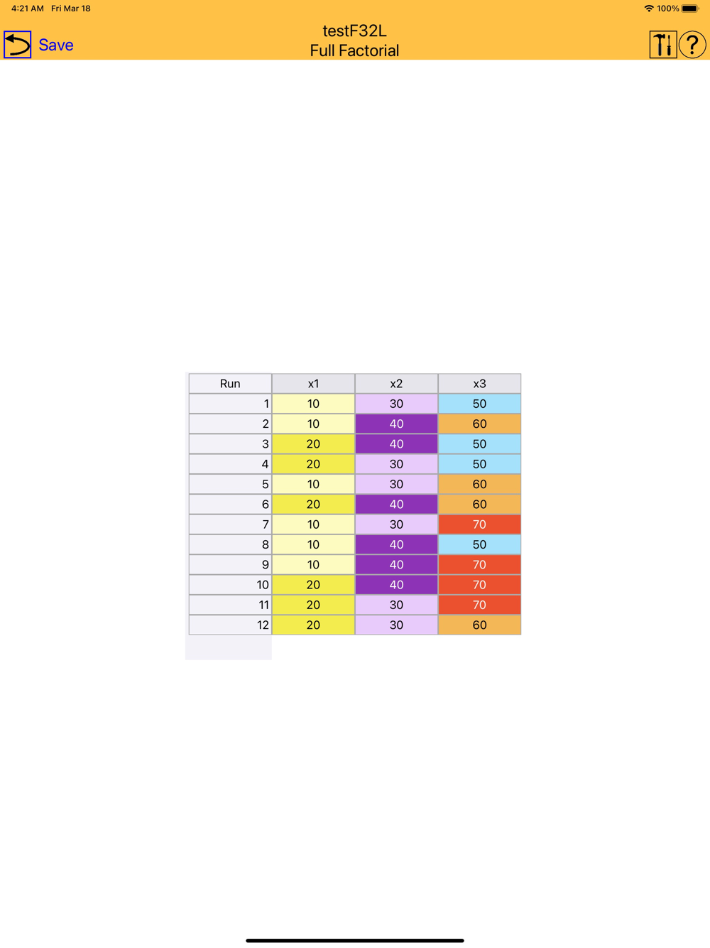 You can control the way in which a generated design is displayed in the usual ways, by displaying factor levels as values or as factor level indices. Unique to the DoE Toolkit , you can also assign colors to factor levels and display a generated design using colors to represent factor levels.
