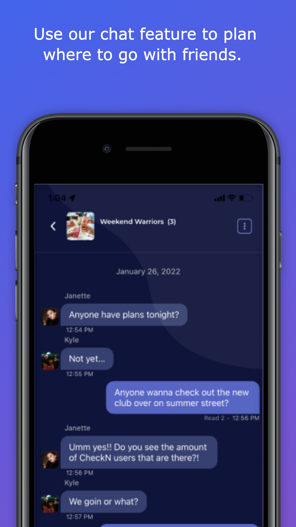 Just as other GPS apps can show you where a ride is or where traffic is - right now, CheckN shows you where the people are - right now. The app tells you where the hottest places and venues are in real-time. It shows where everyone in your extended friend group is right now. It also shows the thumbnail pics of the people you haven’t met yet who are at a particular location right now. It even shows the ratio of men to women at each location.