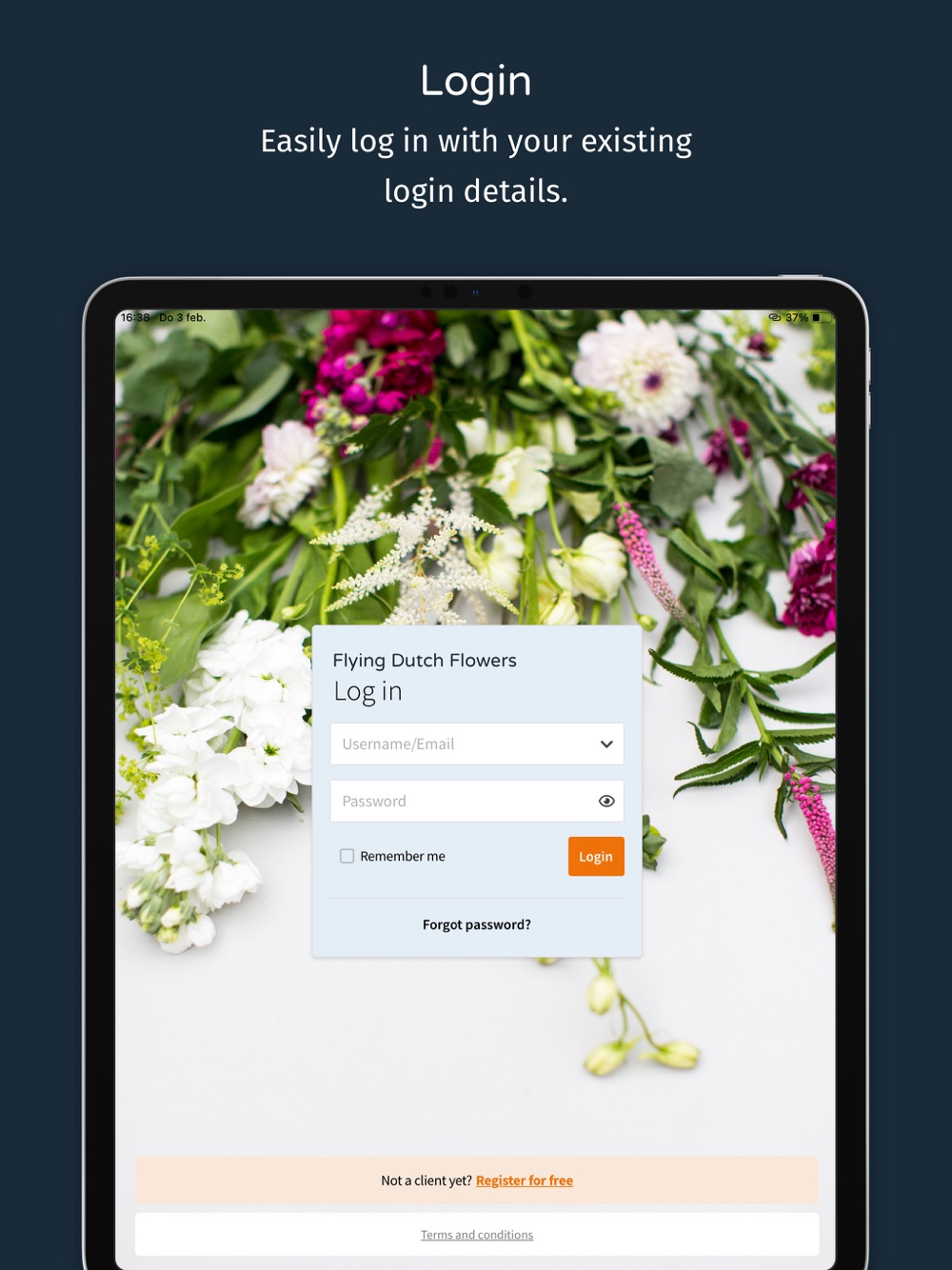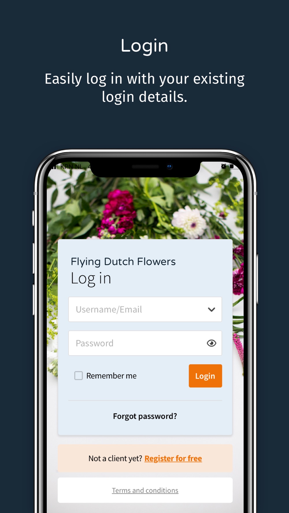 Are you already a Flying Dutch Flowers customer and do you normally place orders through the webshop on your computer? Just simply log on using the same login details