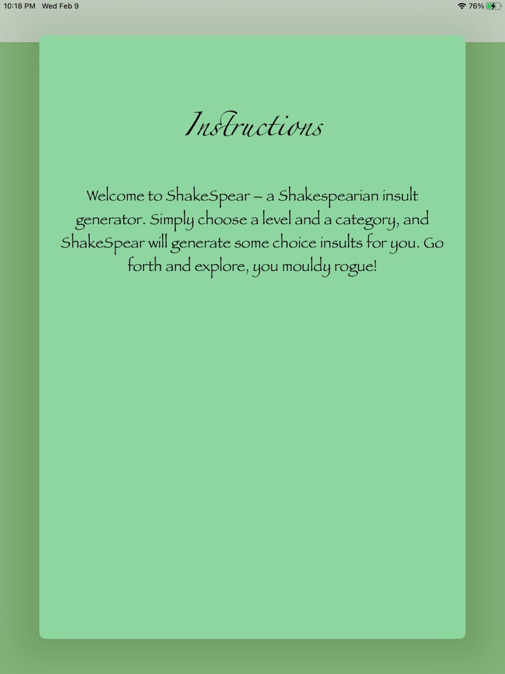 Welcome to ShakeSpear – a Shakespearean insult generator! Choose an insult level and a category to generate an insult for your situation. Want to impress with unique insults? Download ShakeSpear!